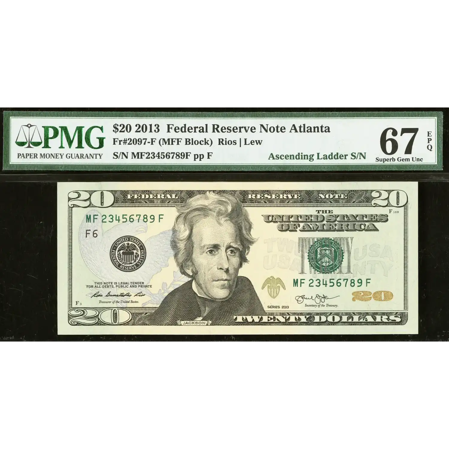 Ascending Ladder Serial Number 23456789 Fr. 2097-F $20 2013 Federal Reserve Note. PMG Superb Gem Unc 67 EPQ.