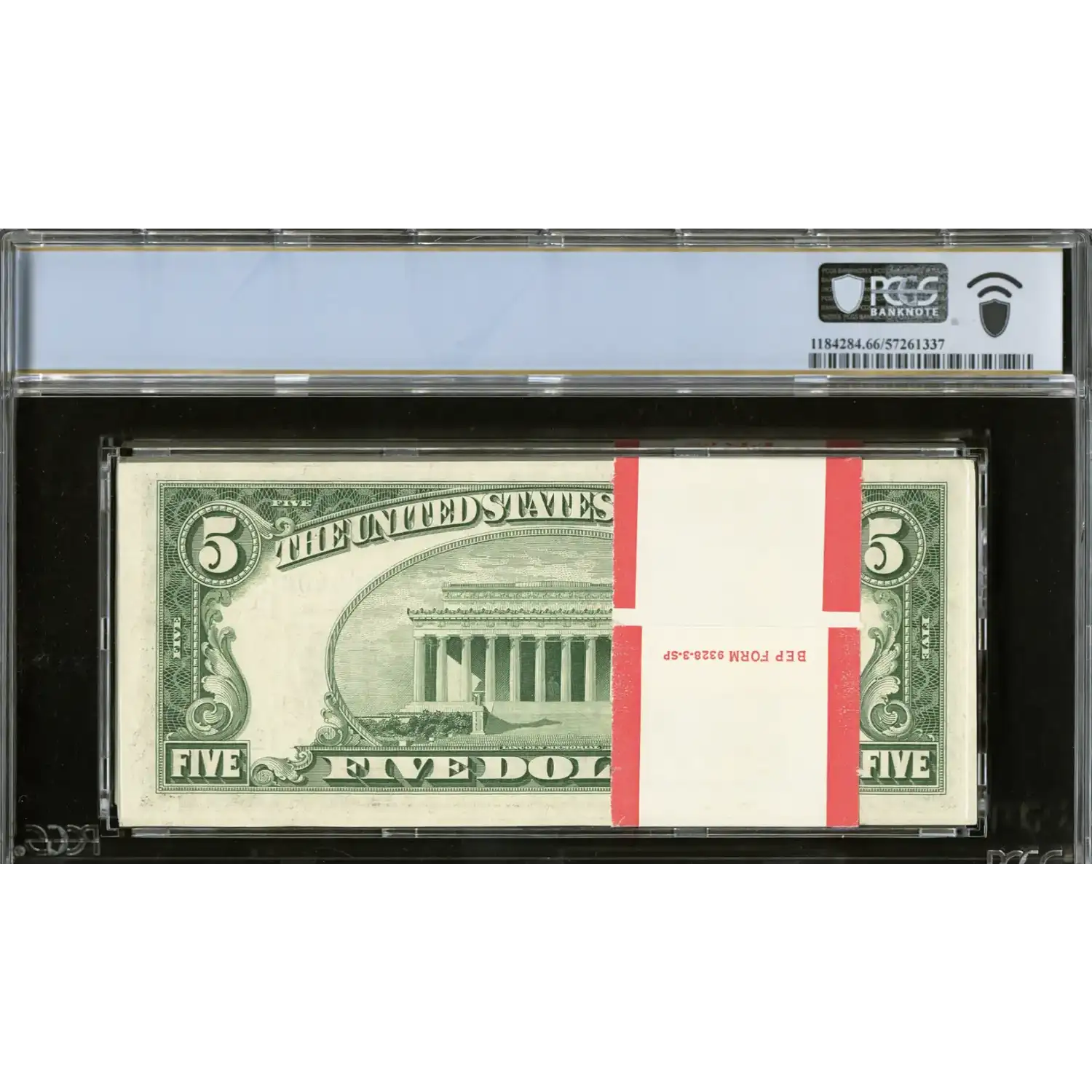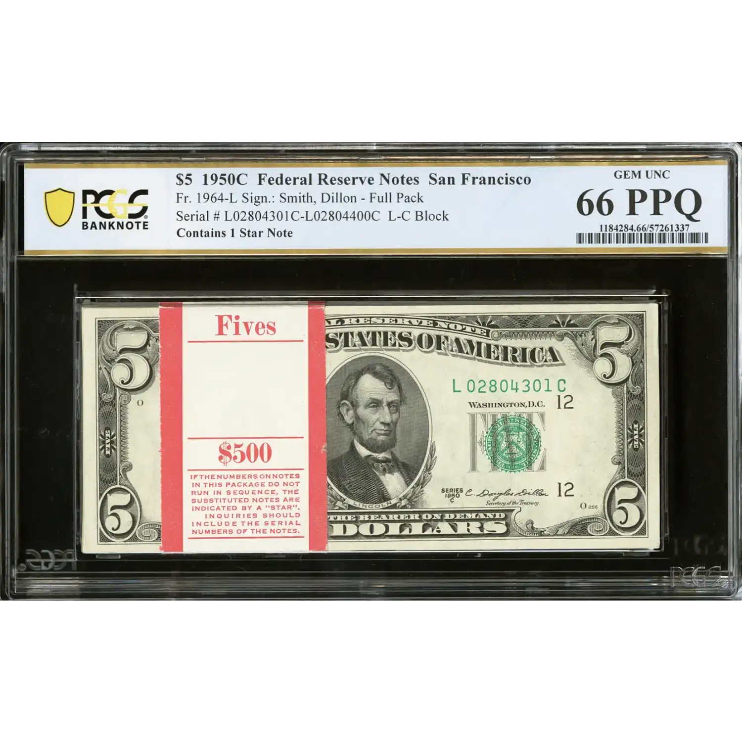 Early $5 FRN packs were seldom saved making them a scarce sighting and thought-provoking opportunity. At Executive Currency, we buy and sell several hundreds of packs each year and it's our first time owning one of these. After reviewing the census data, we learned this pack is entirely unique and only 3 notes graded in the Gem+ realm. All three notes are PMG 67EPQs, the most recent of which sold for $216 in a Stacks Bowers sale. Not surprisingly, stars bring even more. This pack has one star note according to the PCGS label which lists serial number range: L02804301-400C. Delivered for less than $60 per note; this is an exceptional value.