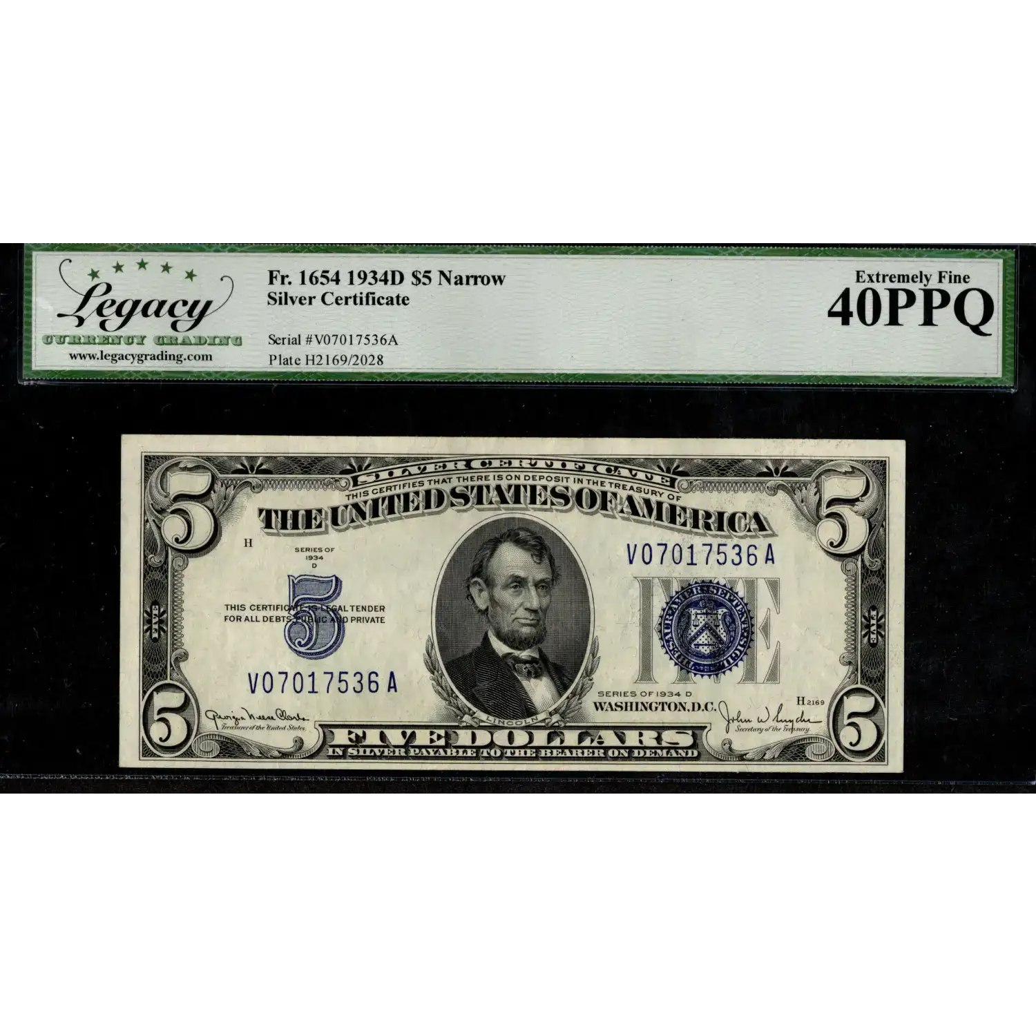 A lovely example of the Narrow Variety of the $5 1934-D Silver Certificate from the V-A Block.