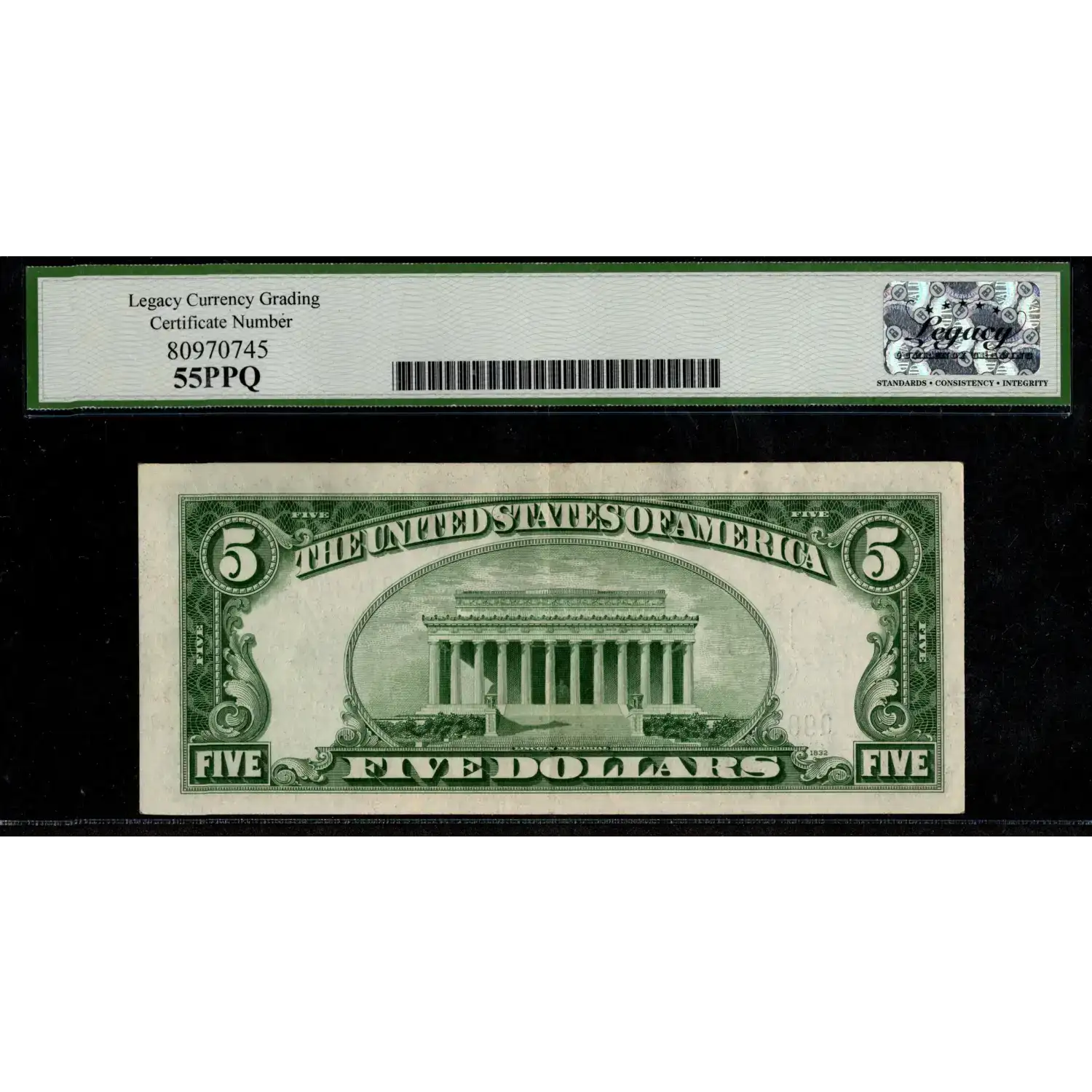 A lovely example of the Wide I Variety of the $5 1934-D Silver Certificate from the Q-A Block.