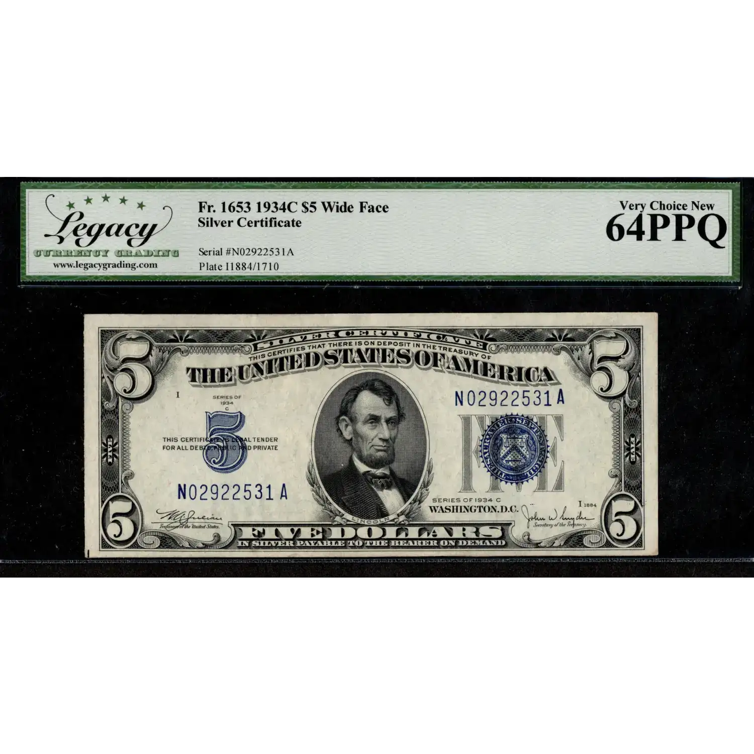 An attractive $5 1934-C Silver Certificate that features the Wide Face variety!