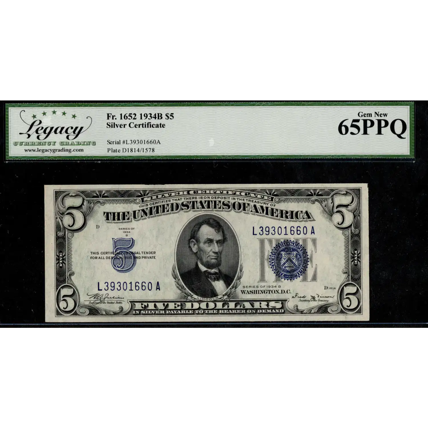 Stunning $5 1934-C Silver Certificate preserved in Gem from the L-A block!