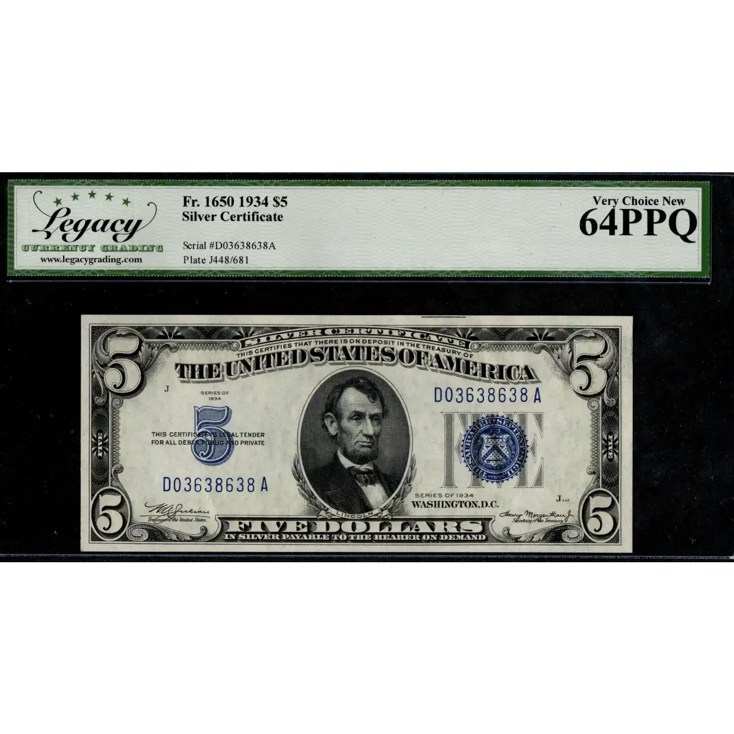A stunning and fully-original $5 1934-A Silver Certificate from the D-A block!