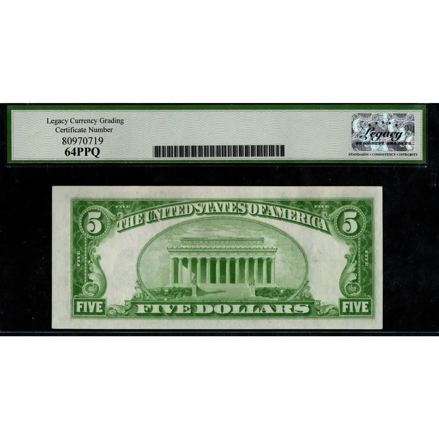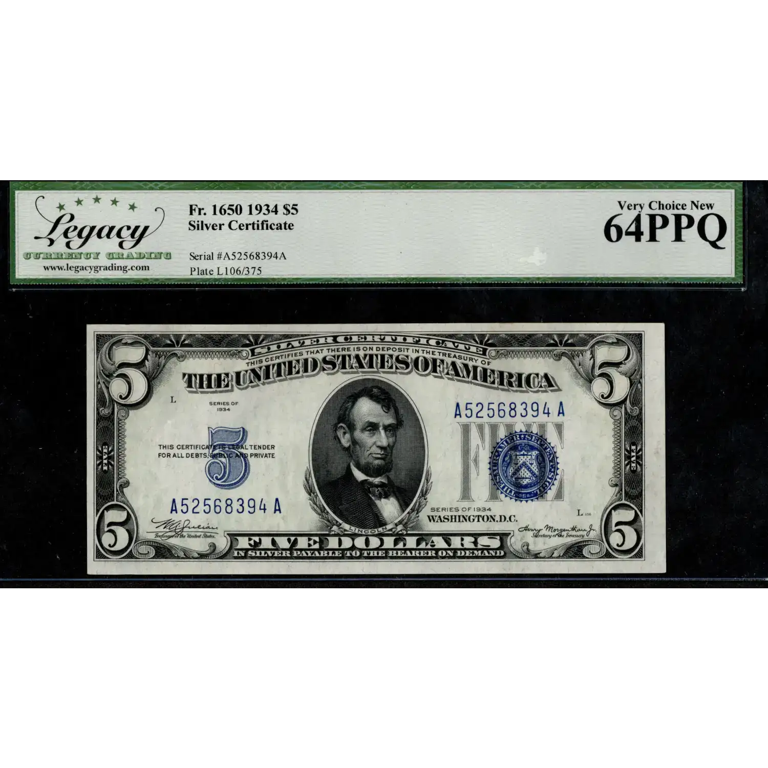 A stunning and scarce $5 1934-A Silver Certificate from the A-A block! There are only TWO notes in all grades listed in the current census!