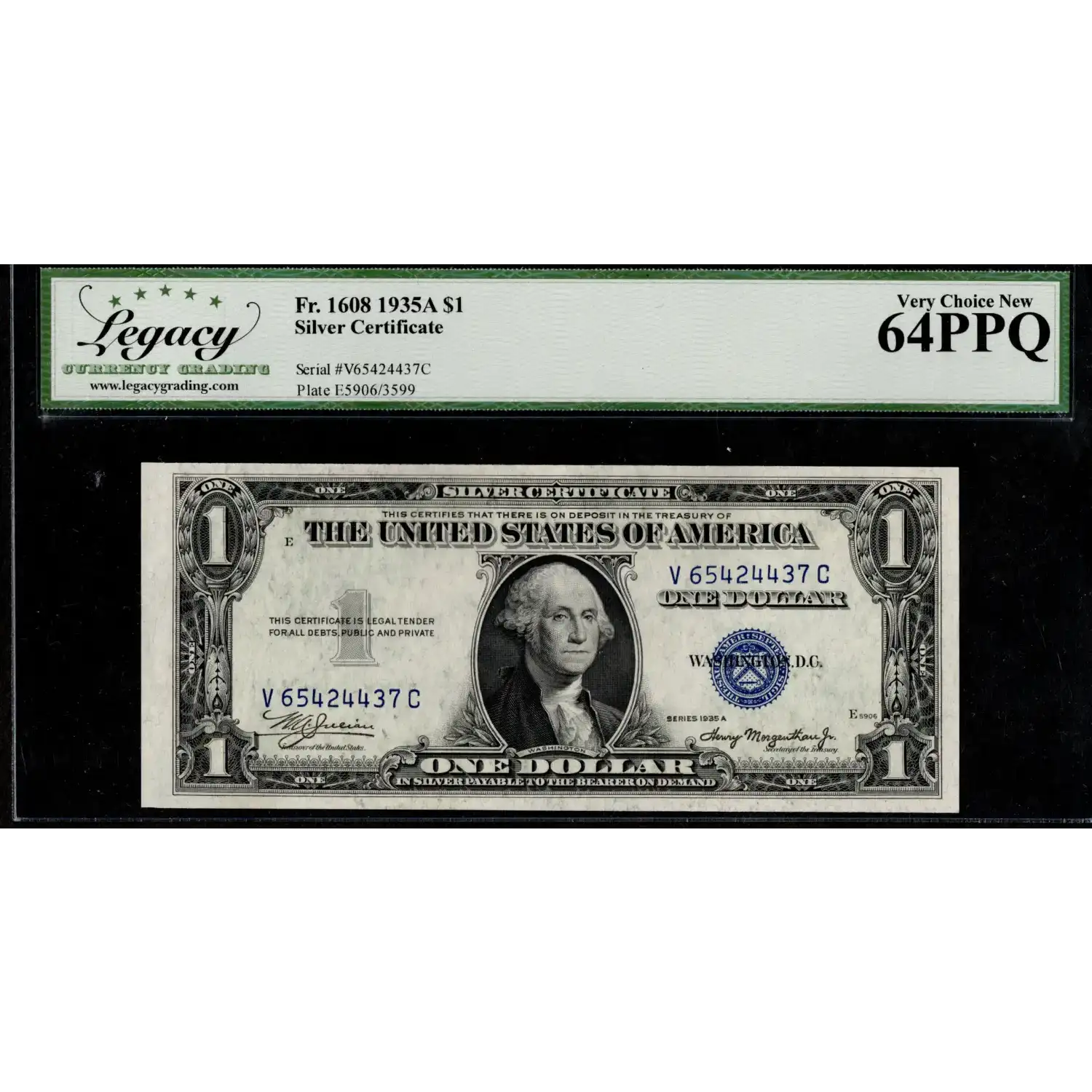 A stunning $1 1935-A Silver Certificate featuring the signature combination of Julian-Morganthau, Jr. This note showcases the V-C Block and has been preserved with spectacular eye-appeal in pleasing collector condition and has been encapsulated in a high-grade holder for generations of protection and enjoyment.
