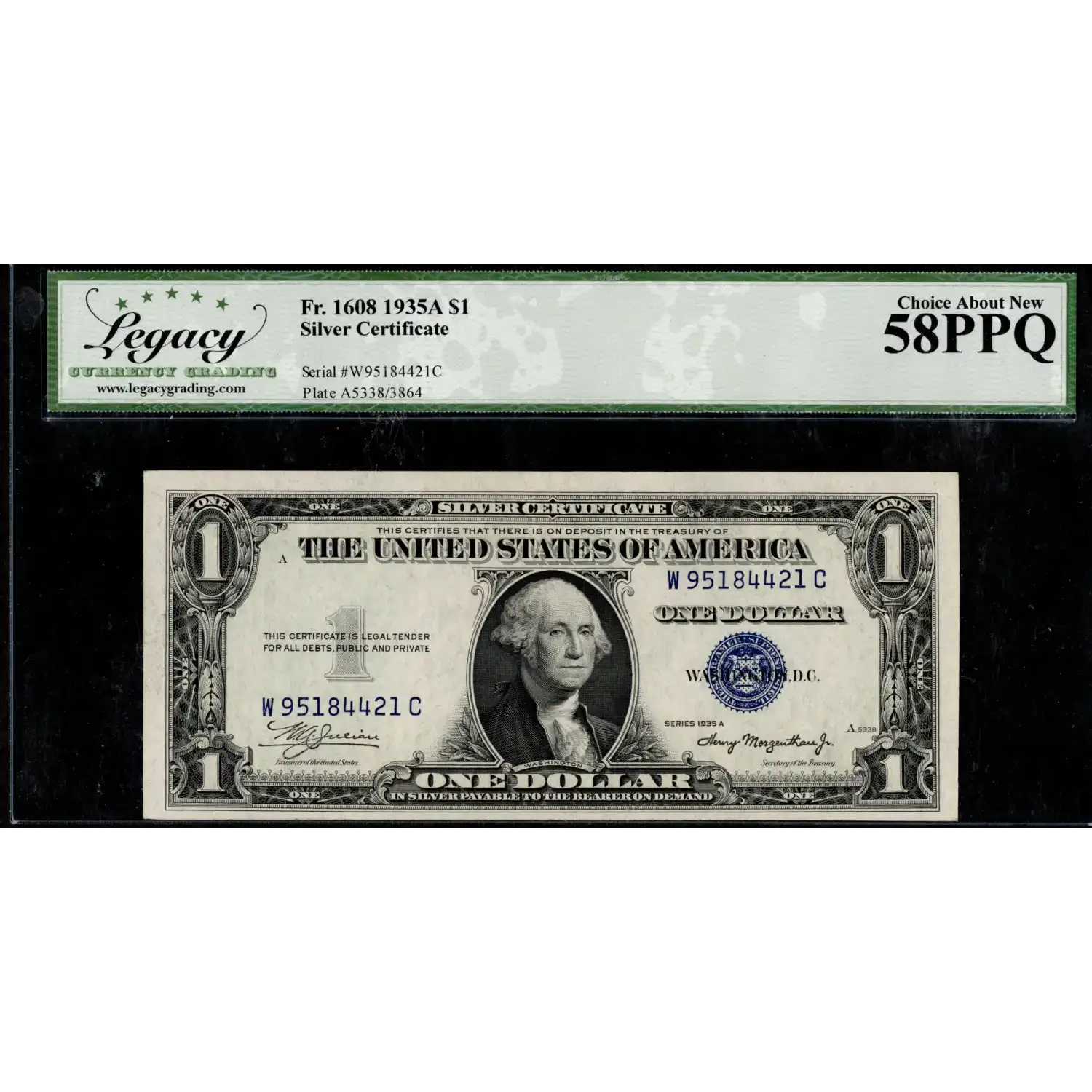A stunning $1 1935-A Silver Certificate featuring the signature combination of Julian-Morganthau, Jr. This note showcases the W-C Block and has been preserved with spectacular eye-appeal in pleasing collector condition and has been encapsulated in a high-grade holder for generations of protection and enjoyment.