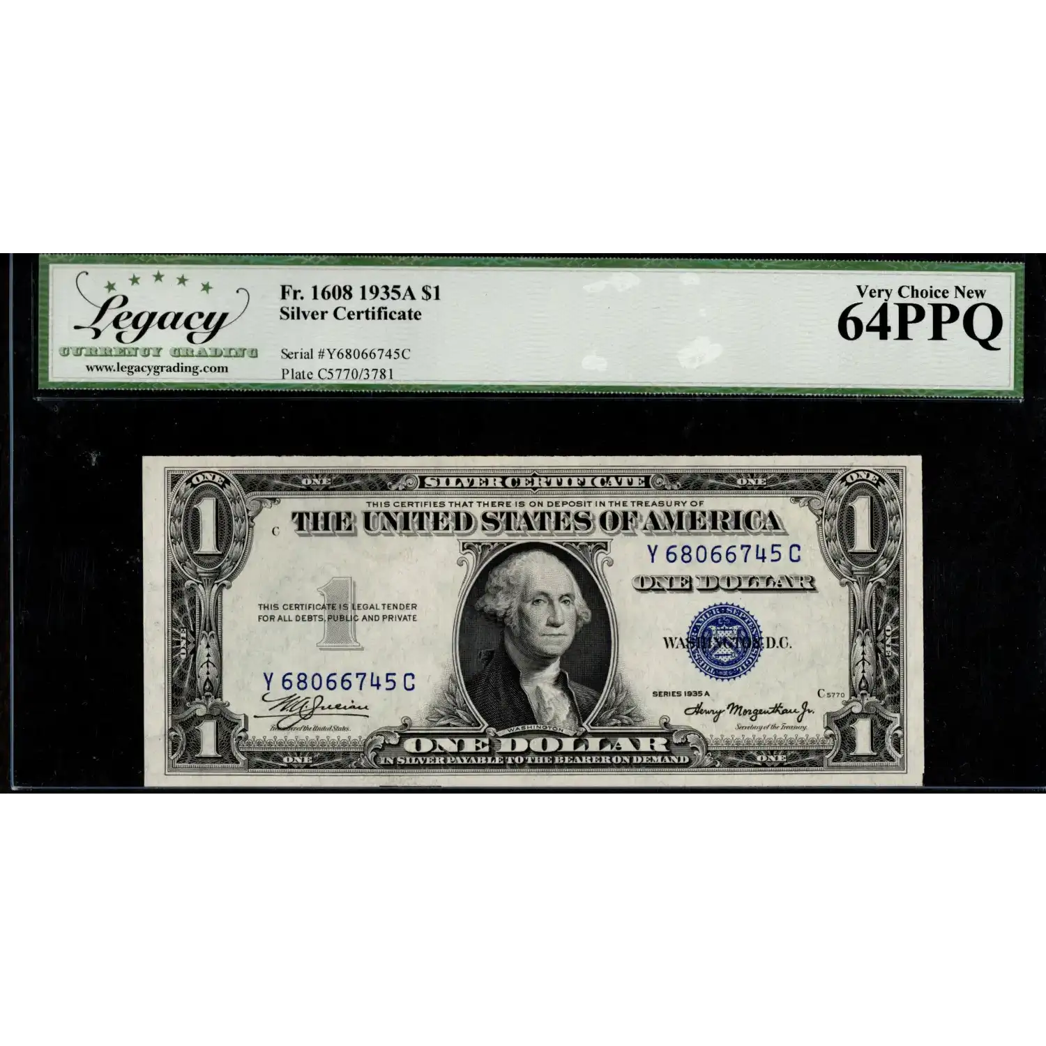 A stunning $1 1935-A Silver Certificate featuring the signature combination of Julian-Morganthau, Jr. This note showcases the Y-C Block and has been preserved with spectacular eye-appeal in pleasing collector condition and has been encapsulated in a high-grade holder for generations of protection and enjoyment.
