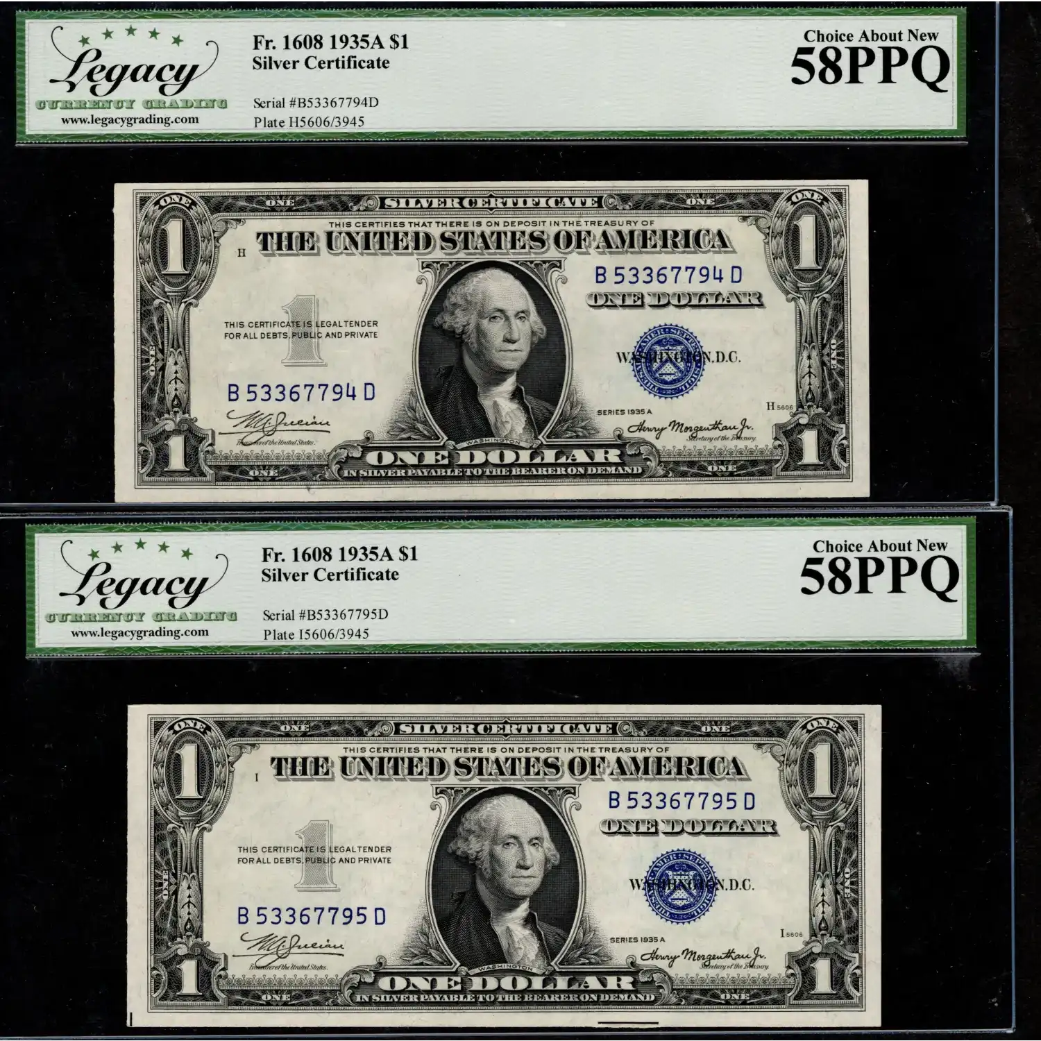 A stunning and sequential pair of $1 1935-A Silver Certificate featuring the signature combination of Julian-Morganthau, Jr. These notes showcase the B-D Block and have been preserved with spectacular eye-appeal in pleasing collector condition.