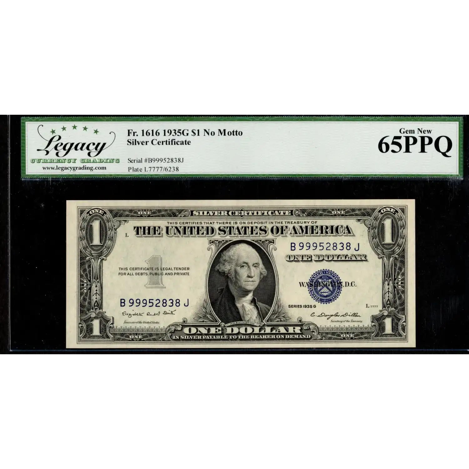 A highly-collectible transitional series with some notes from 1935-G eventually bearing the motto, "In God We Trust" on the back, while those printed early in the run remain without the motto and are often referred to as "Atheist Notes." Preserved in high-grade with terrific eye-appeal for even the most discerning collector!