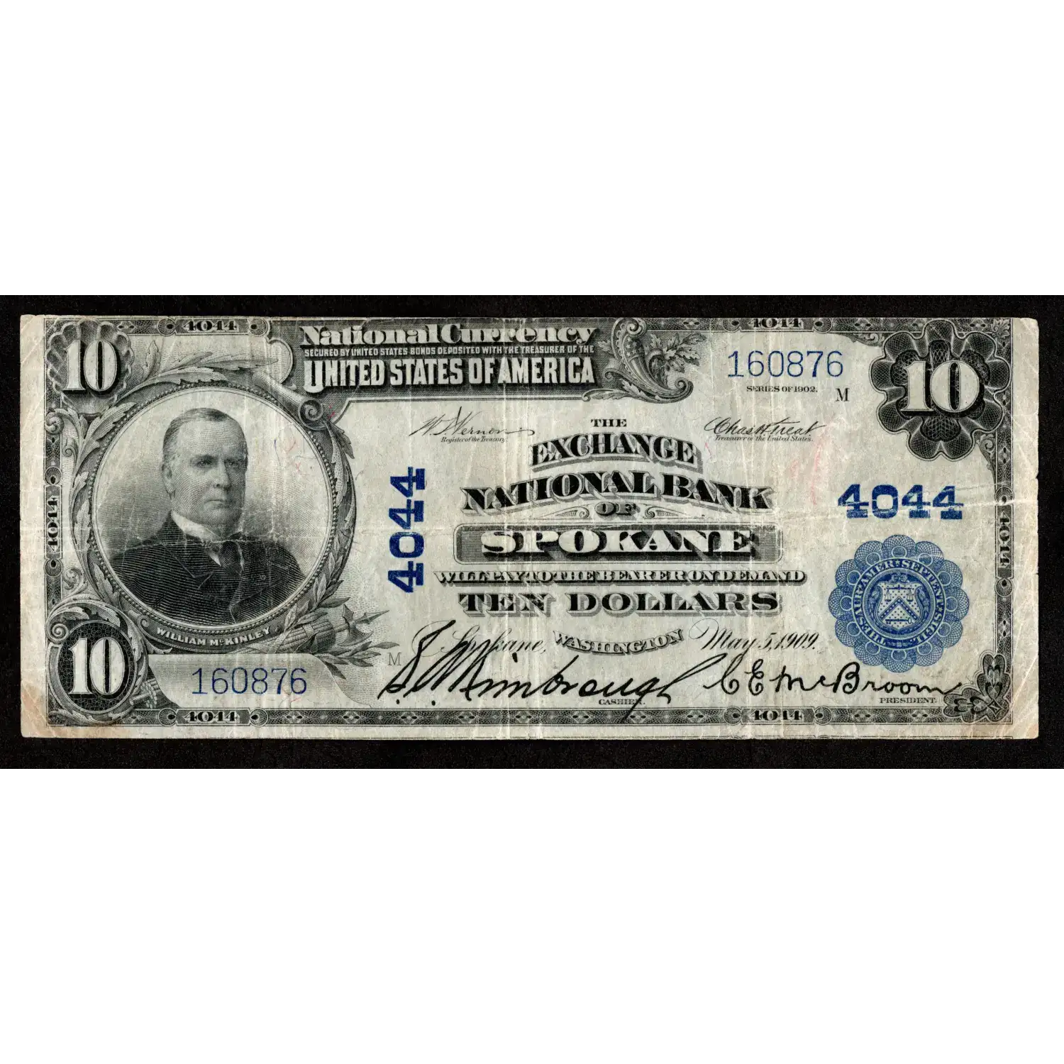 A bright and original note from this large-only Spokane bank that closed its doors in 1929, this $10 features vibrant color and dark engraved signatures.