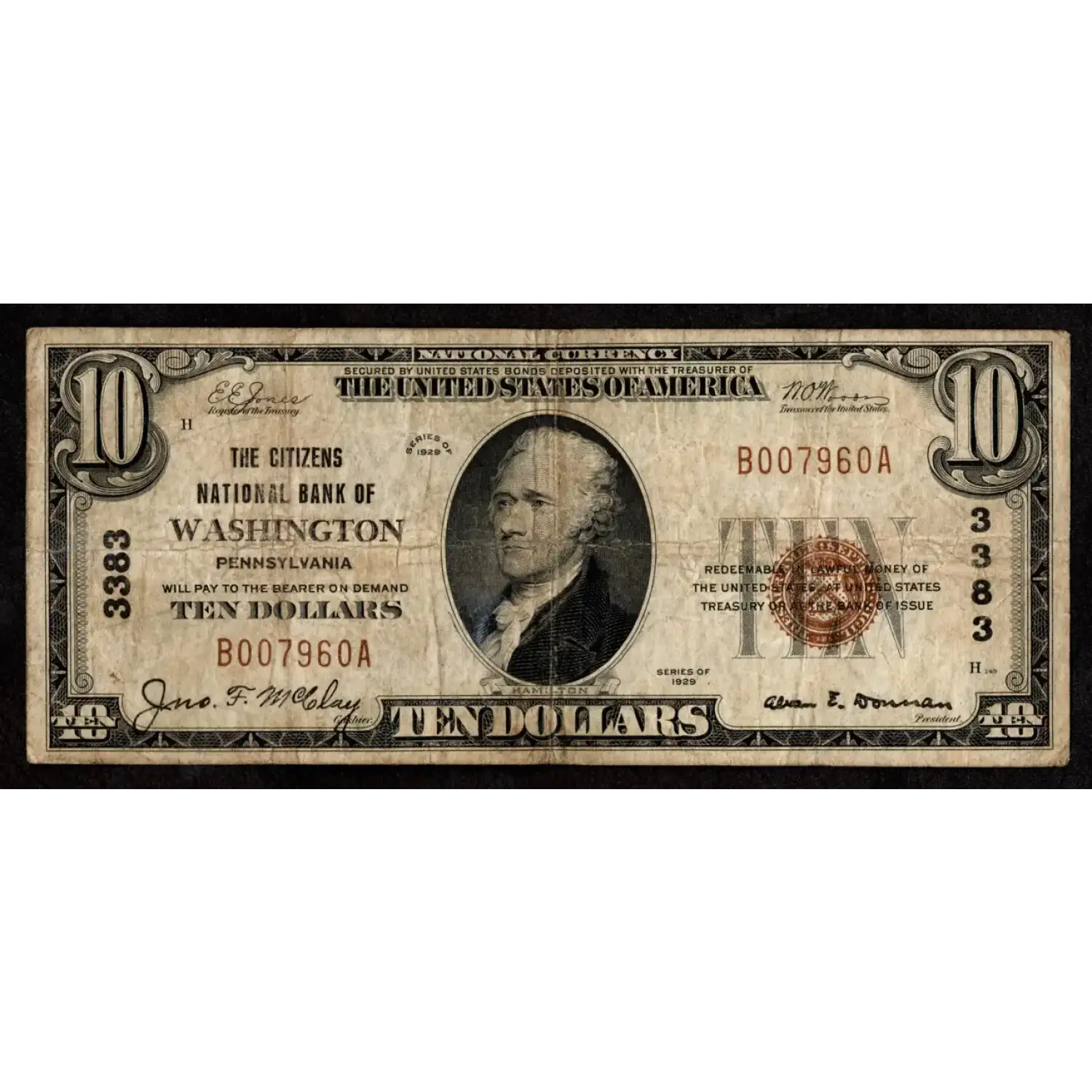 An attractive mid-grade example from The Citizens National Bank of Washington, PA. This Ch# 3383 is of special interest to some national banknote collectors that seeek two state titles. Problem-free example with no hidden pinholes or flaws.