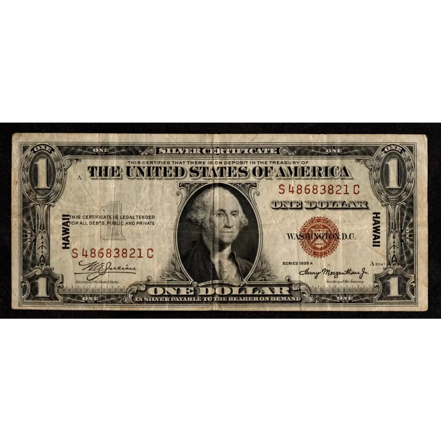 Attractive and affordable World War II Emergency Issue with the readily identifiable brown seal and serials that could have been easily demonetized had it fallen under enemy control. As always, take a look at both sides, but we think you'll be quite plesaed with this cheap and problem free Hawaii note.