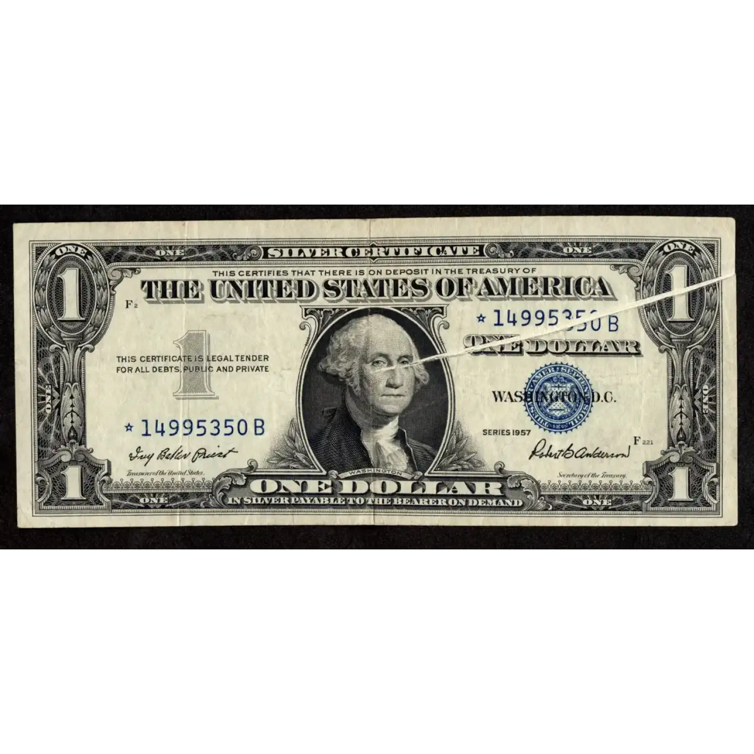 An incredible and exciting gutter fold error that affects ALL THREE PRINTINGS! The sheet pleated prior to the first (back) printing and remaind that way until after the overprint was applied. As you can see, the error is dramatic and easily recognizable, but most impressively, this 3.25" double sided gutter fold error occurs on a silver certificate STAR note!
