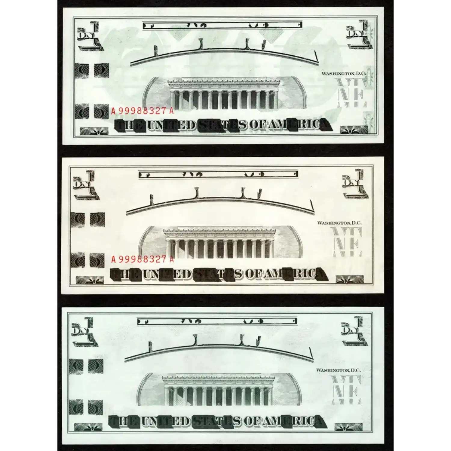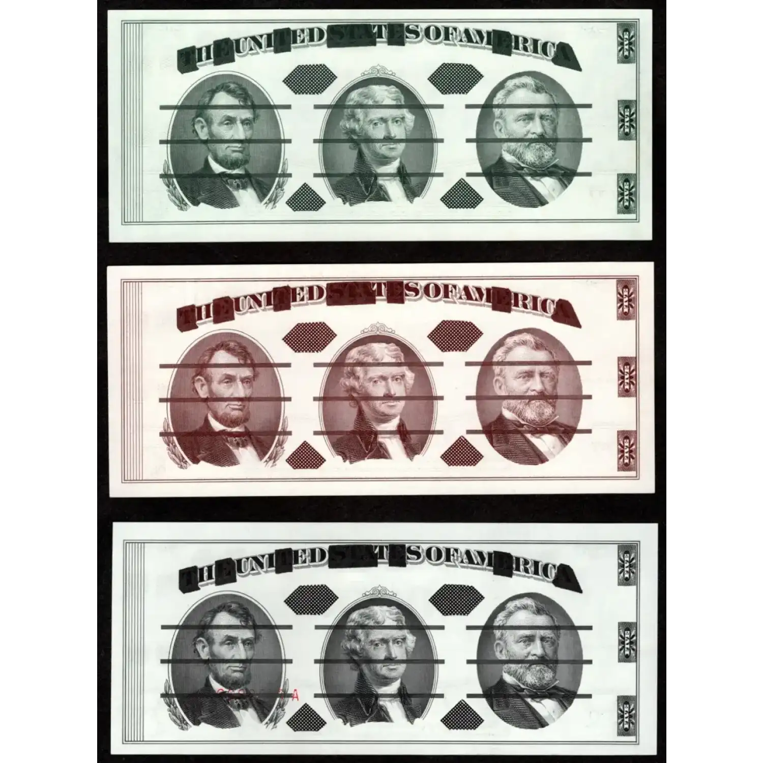 They should have been destroyed, but it is permissible to collect these interesting items as they are not obligations of the United States. Also, make note of the cancellation bars that are printed through the portraits. This is the scarcer Giori variety with Lincoln, Jefferson, and Grant portraits. Gioris are known by their center portrait, either Jefferson or Washington, with the Washington examples being printed in 1976 in Geneva, NY and they are known in much larger numbers than the Jefferson center portrait examples. All Jefferson Gioris have inverted backs featuring the Lincoln Memorial.