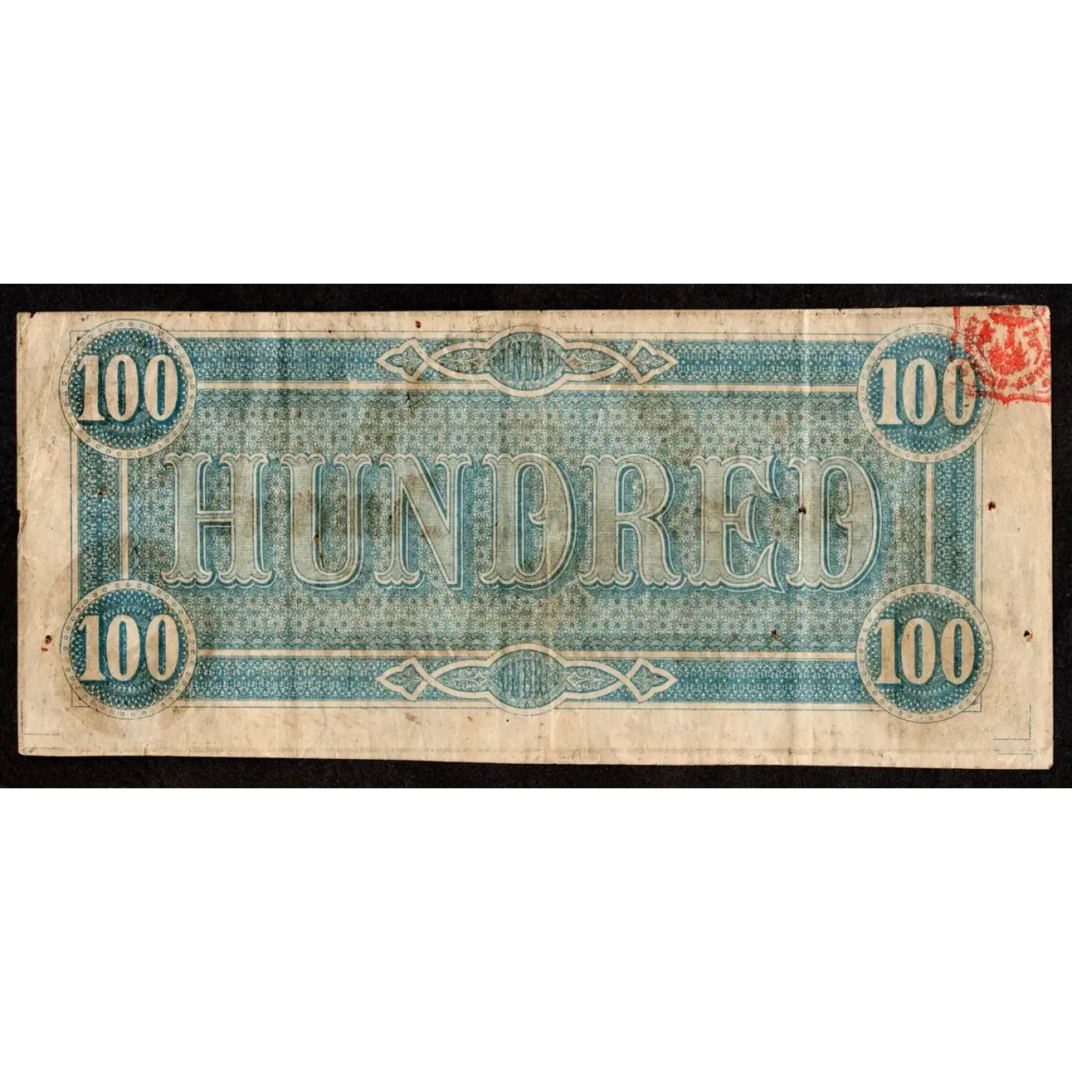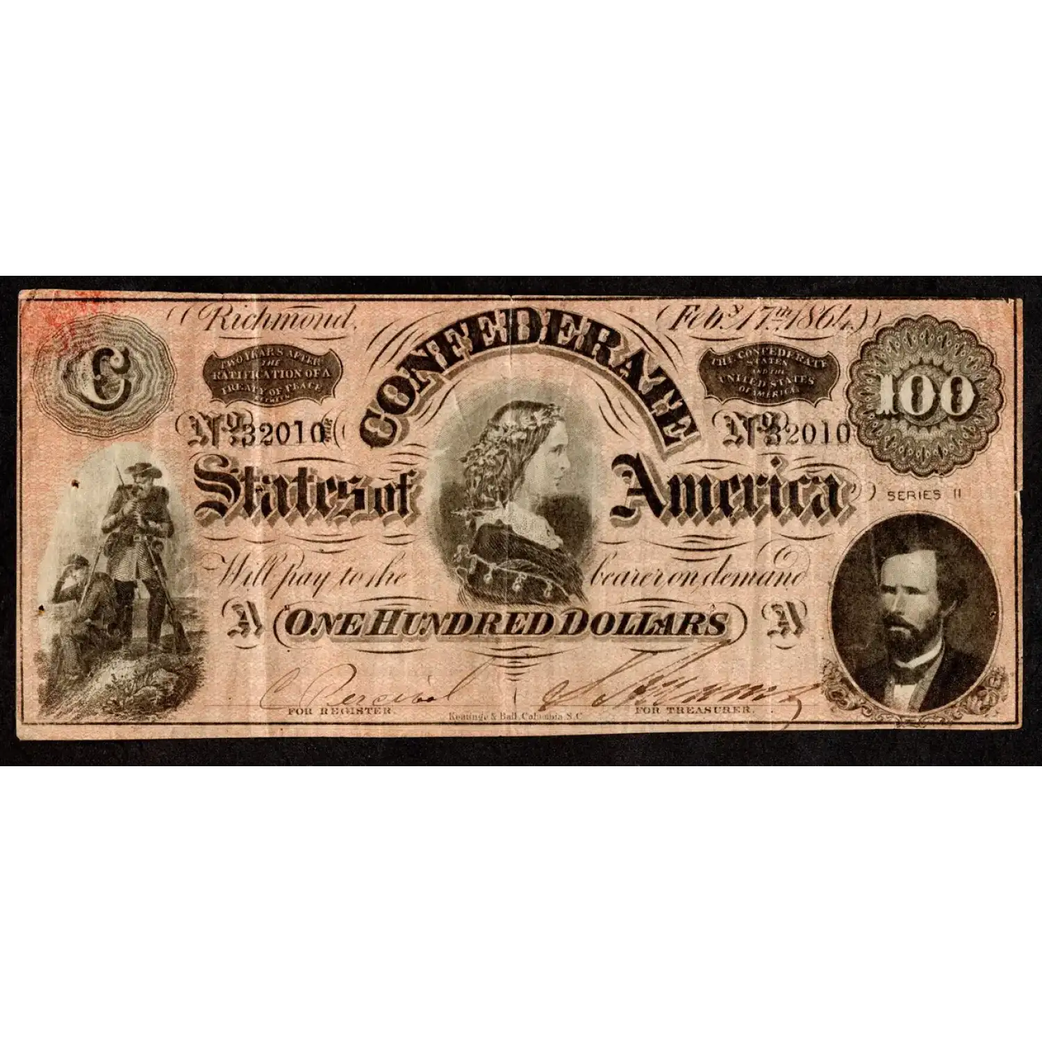 At center on this popular T-65 is a portrait of Lucy Holcombe Pickens, famous South Carolinian socialite and First Lady of South Carolina. At left is a vignette of two Confederate soldiers while the bust of George Wythe Randolph, Secretary of War, is pictured at the right. A partial red CSA Treasury stamp appears at upper right on the back of this example that has a few edge splits/ nicks and exactly eight small pinholes that become visible when the note is backlit, but otherwise blend into the design which makes them difficult to discern. The color remains pleasing with dark signatures still present.