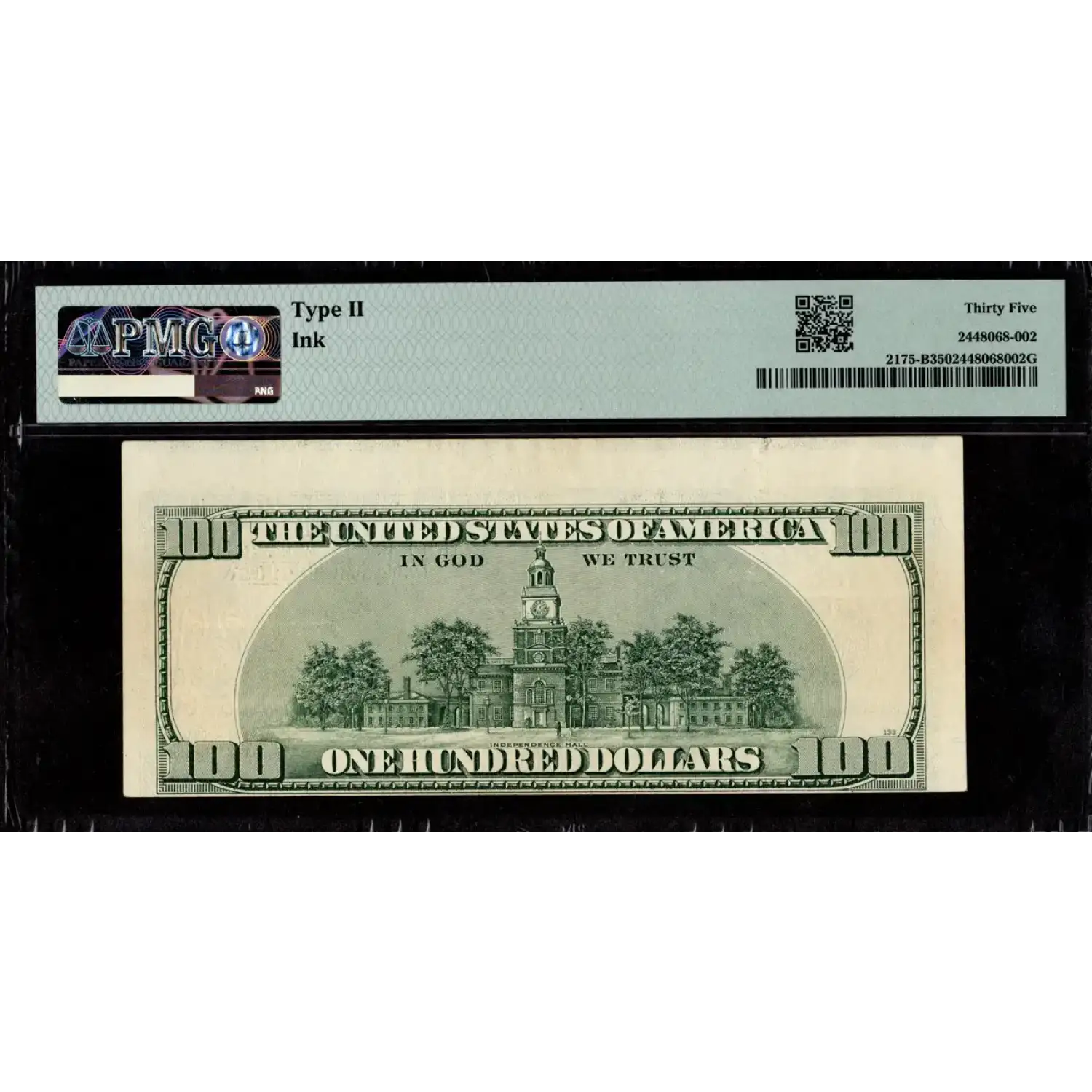 An eye catching Type II error that surprisingly escaped detection prior to being released into circulation by the BEP. Big Head $100 inverted overprint errors are anything but common. This note features the serials and green treasury seal upside down along with the district designator! Most impresively, this note includes a portion of the adjacent note above the extra-wide top margin. There's a single ink line to the right of Franklin's portrait that is responsible for a significant discount for a minor inconvenience. Truthfully, there aren't many opportunities to acquire this error on this denomination; therefore, we're thrilled to have it available for our eager collecting community!