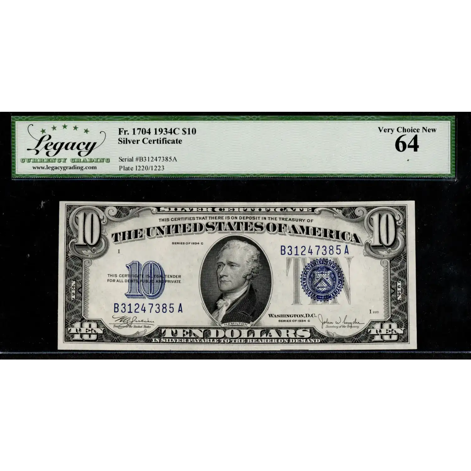 Nice centering and wonderful color are the hallmarks of this well preserved $10 1934-C Blue Seal Hamilton.