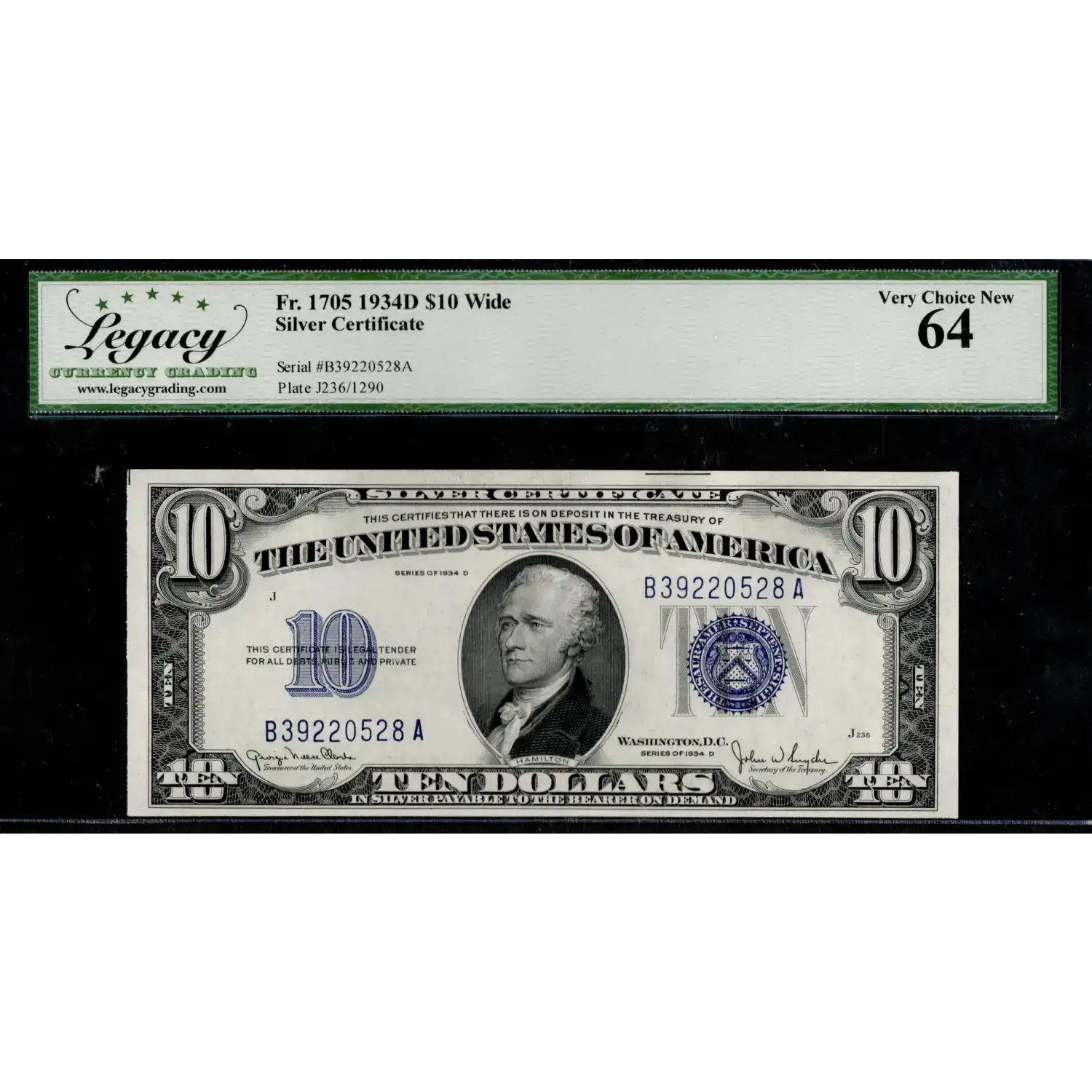 A bright example with bold blue inks and blazing white paper! This note looks like it was just printed yesterday and offers a high-grade and stunning example of a WIDE $10 1934-D Silver Certificate.