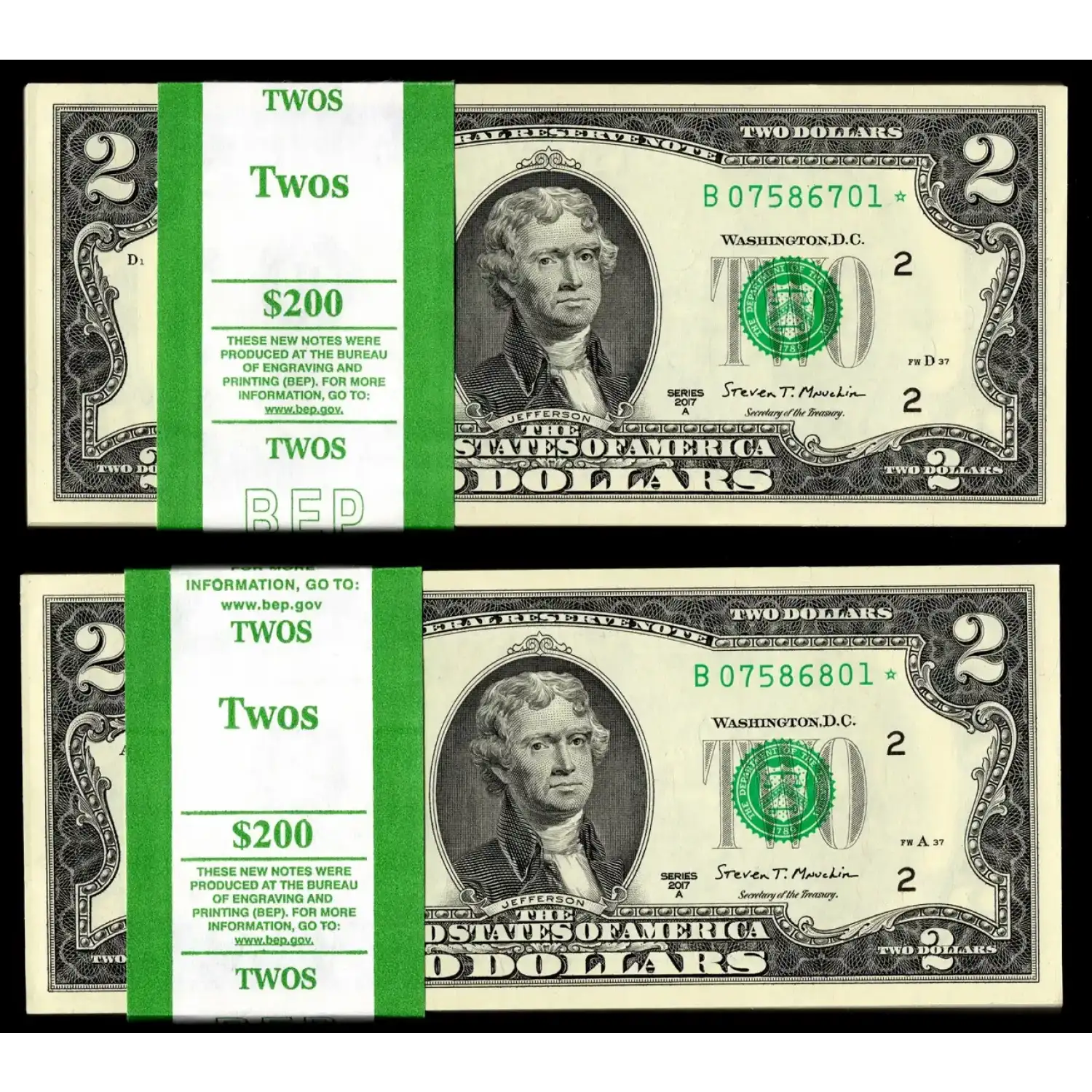 Secure a pair of consecutive star packs with each featuring 100 sequential replacement notes in original BEP strap. As such, you will receive 200 consecutive star deuces.