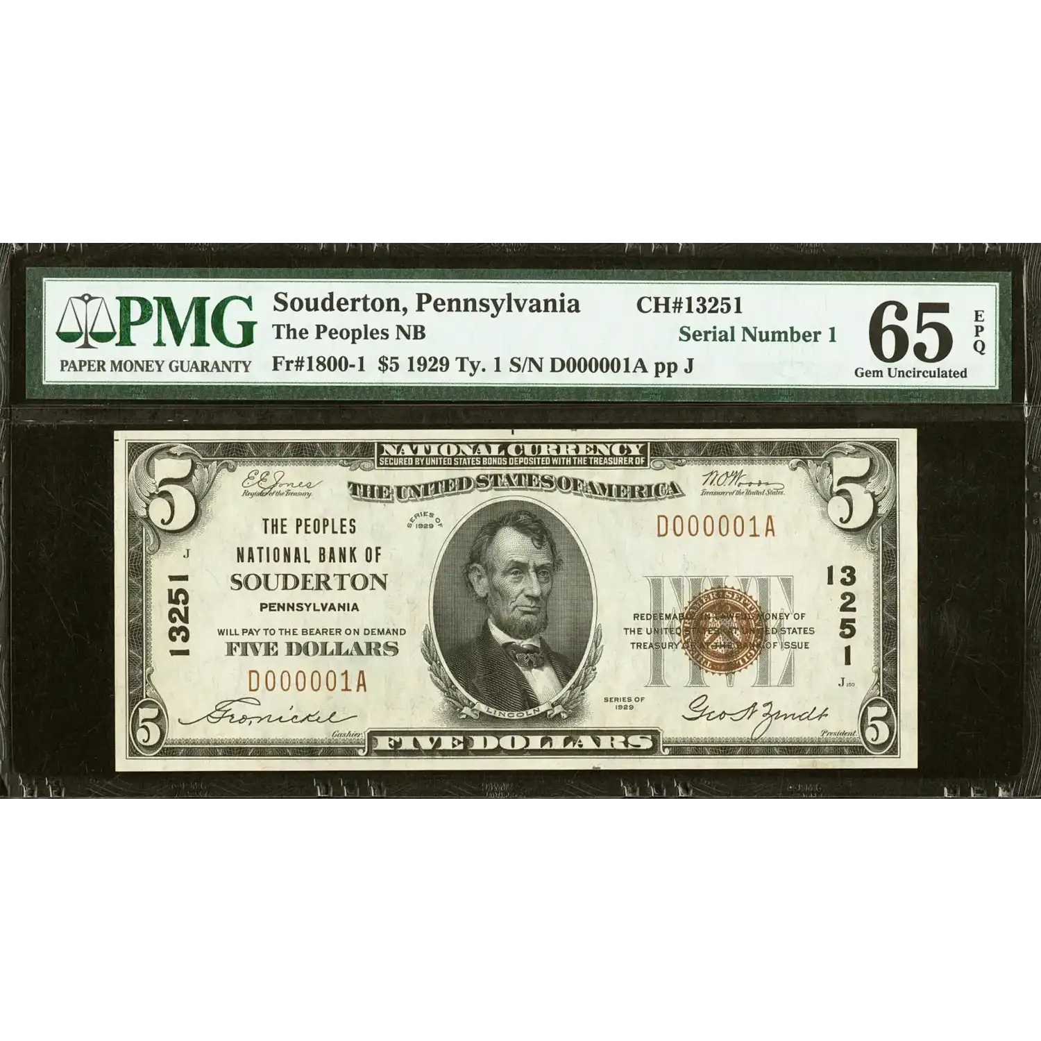 This is a beautiful note from the first sheet of $5s issued by this Montgomery County bank after it opened its doors in November of 1928. Four wide margins surround this crackling fresh and well embossed Serial Number One example.