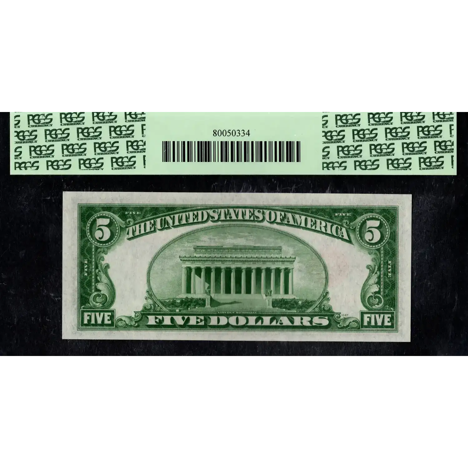 Original surfaces, generous and even margins, and a fire-engine red overprint are some of the highlights of this early 1928-C five dollar legal tender that's positioned one point shy of Superb Gem.