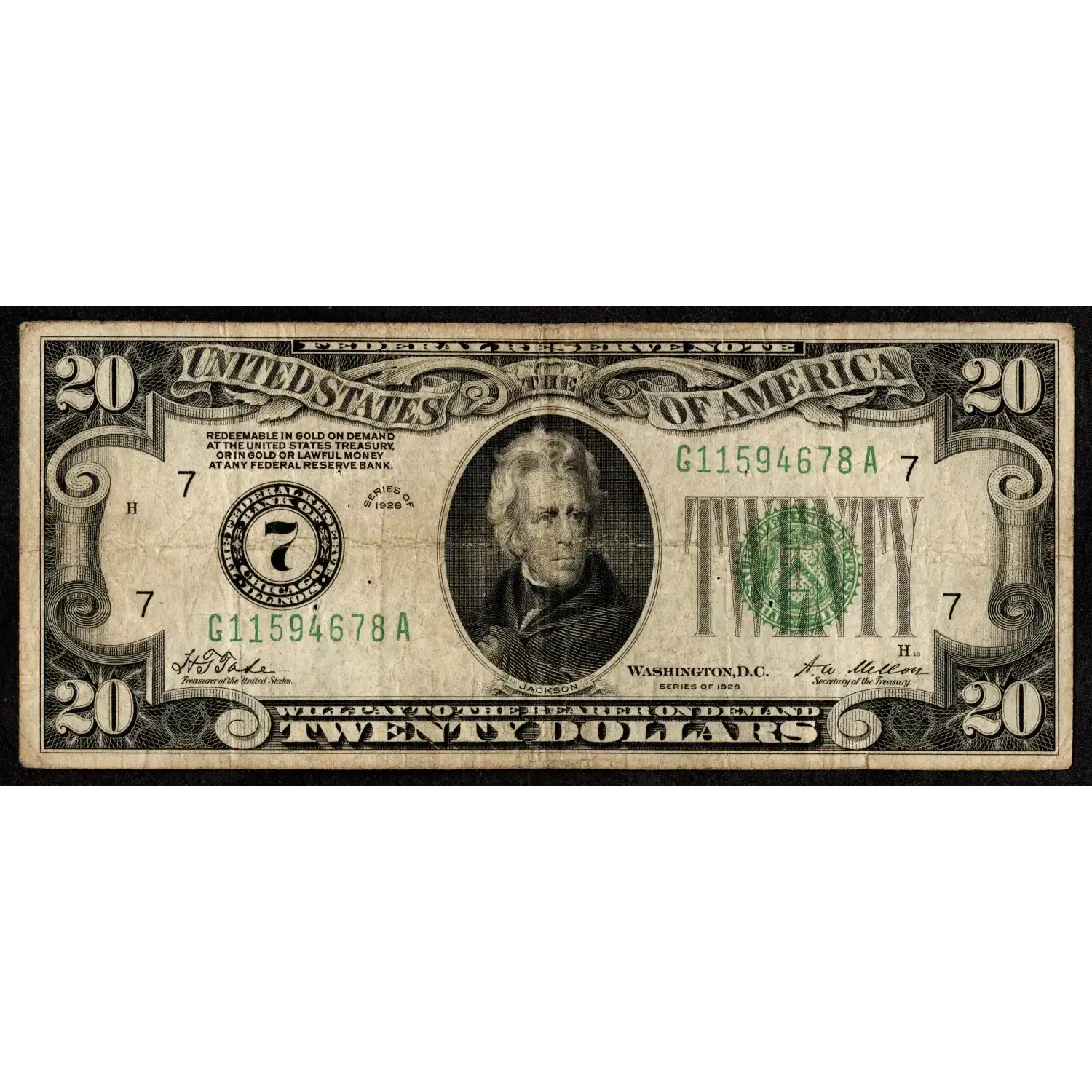 A cheap opportunity to add a "Redeemable in Gold" note with the early Numeral Seal from the seventh district of Chicago. Circulating in the Windy City in the 1930s means this note could have passed through the hands of the iconic gangsters from the era. Did Al Capone, Bugs Morgan, or Sam Giancana hold this note? We can't say for sure, but with the eight scattered pinholes that become visible when backlit, it wouldn't be impossible to imagine a gangster sending a strong message with this note.