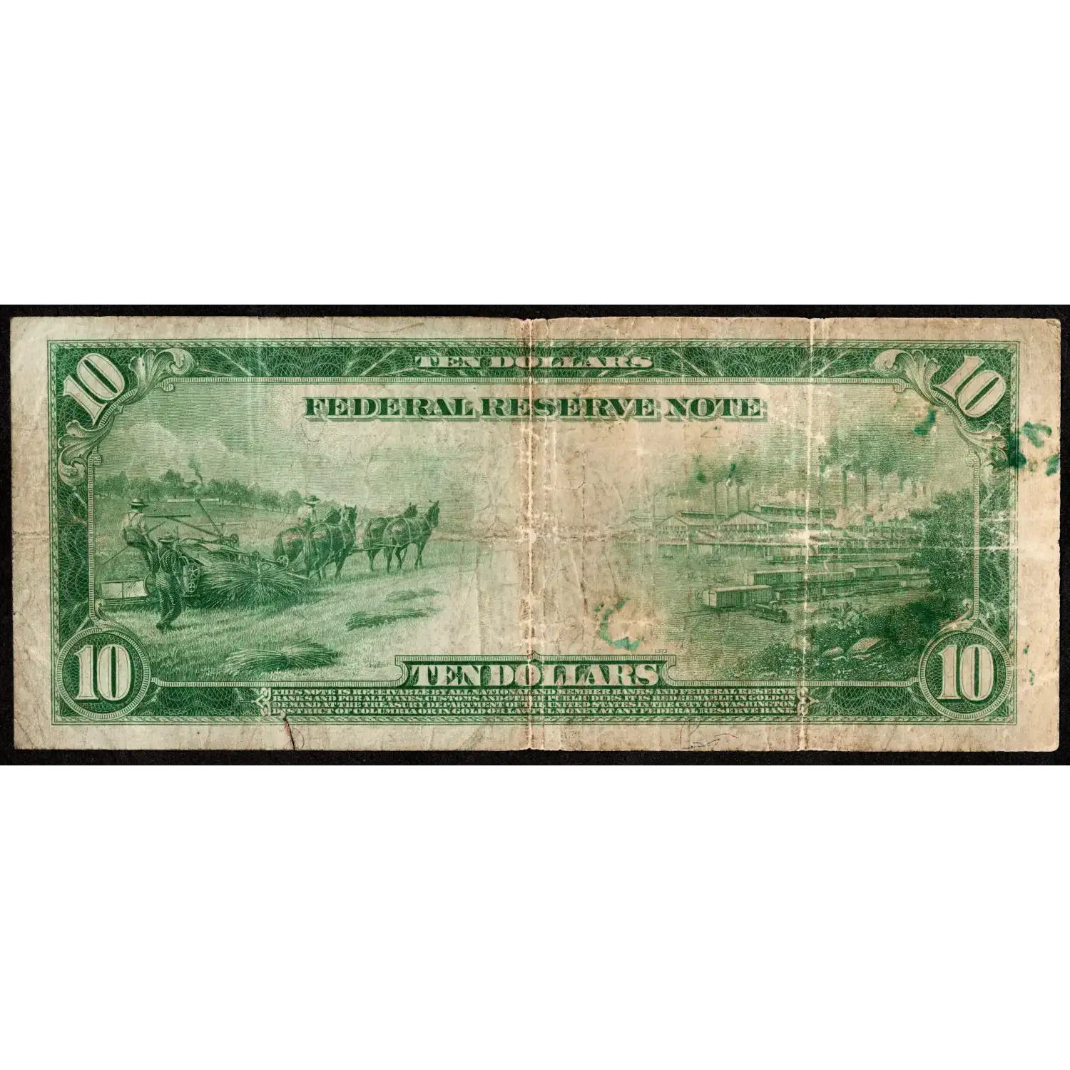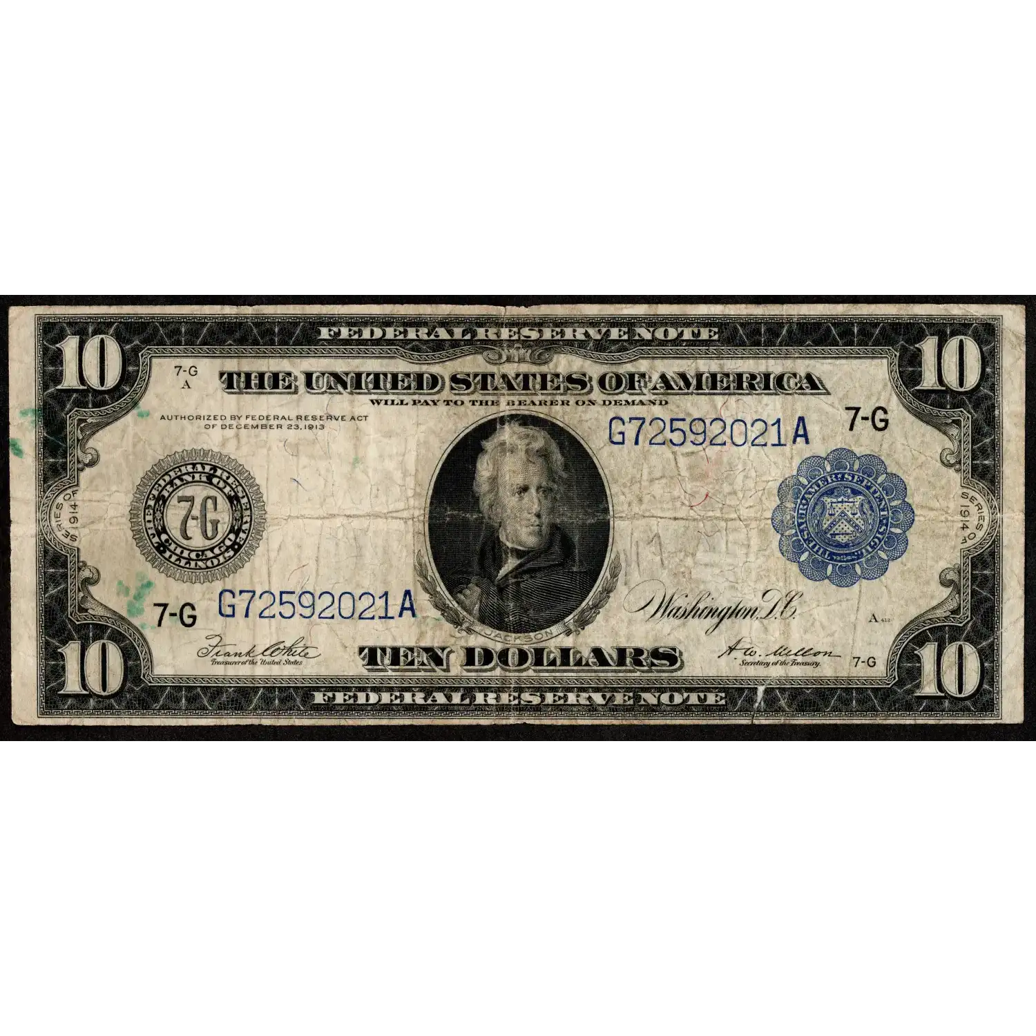 A cheap example of a charming $10 1914 Blue Seal from Chicago. This note has some extraneous green ink marks and a small tear in the bottom margin which helps keep the price so low on this early Federal Reserve Note!