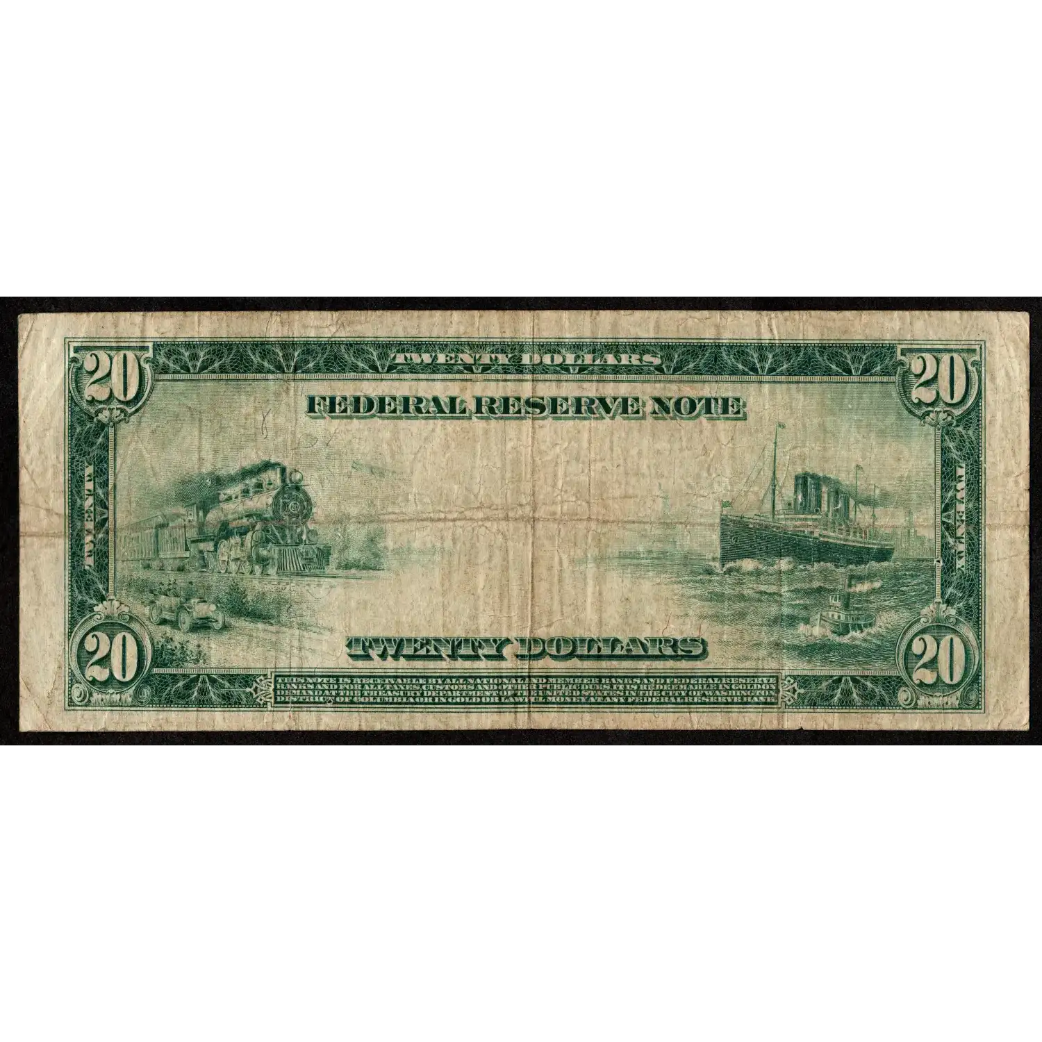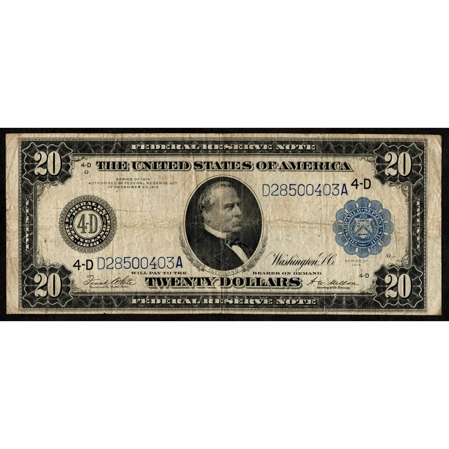 An attractive example of the money that served as the precursor to the Federal Reserve Notes we use today. This $20 1914 Cleveland district note features the portriat of Grover Cleveland and has been preserved in mid-grade condition with a few well-concealed pinholes that we observed during our thorough inspection. Such flaws are minor, but have been generously discounted making it an intelligent selection for a collector.