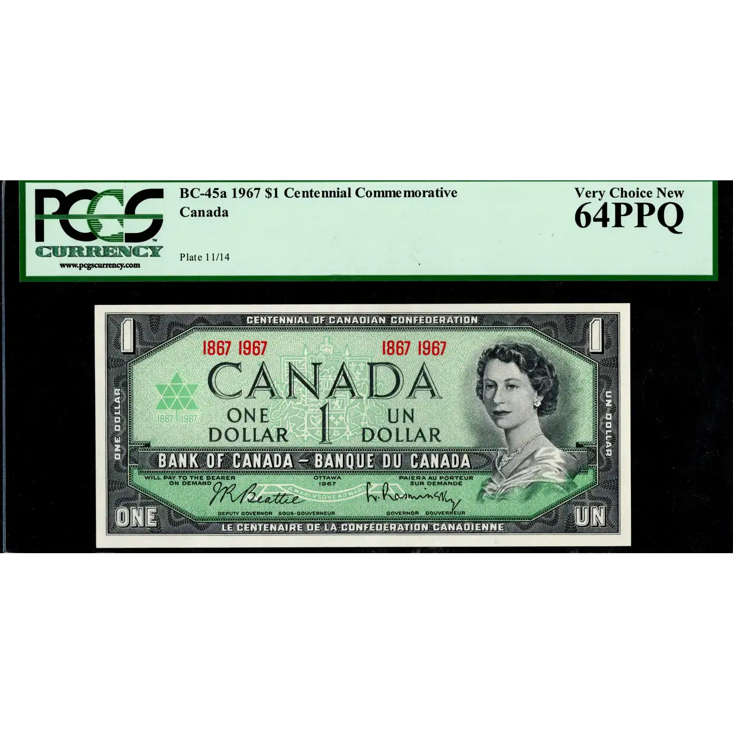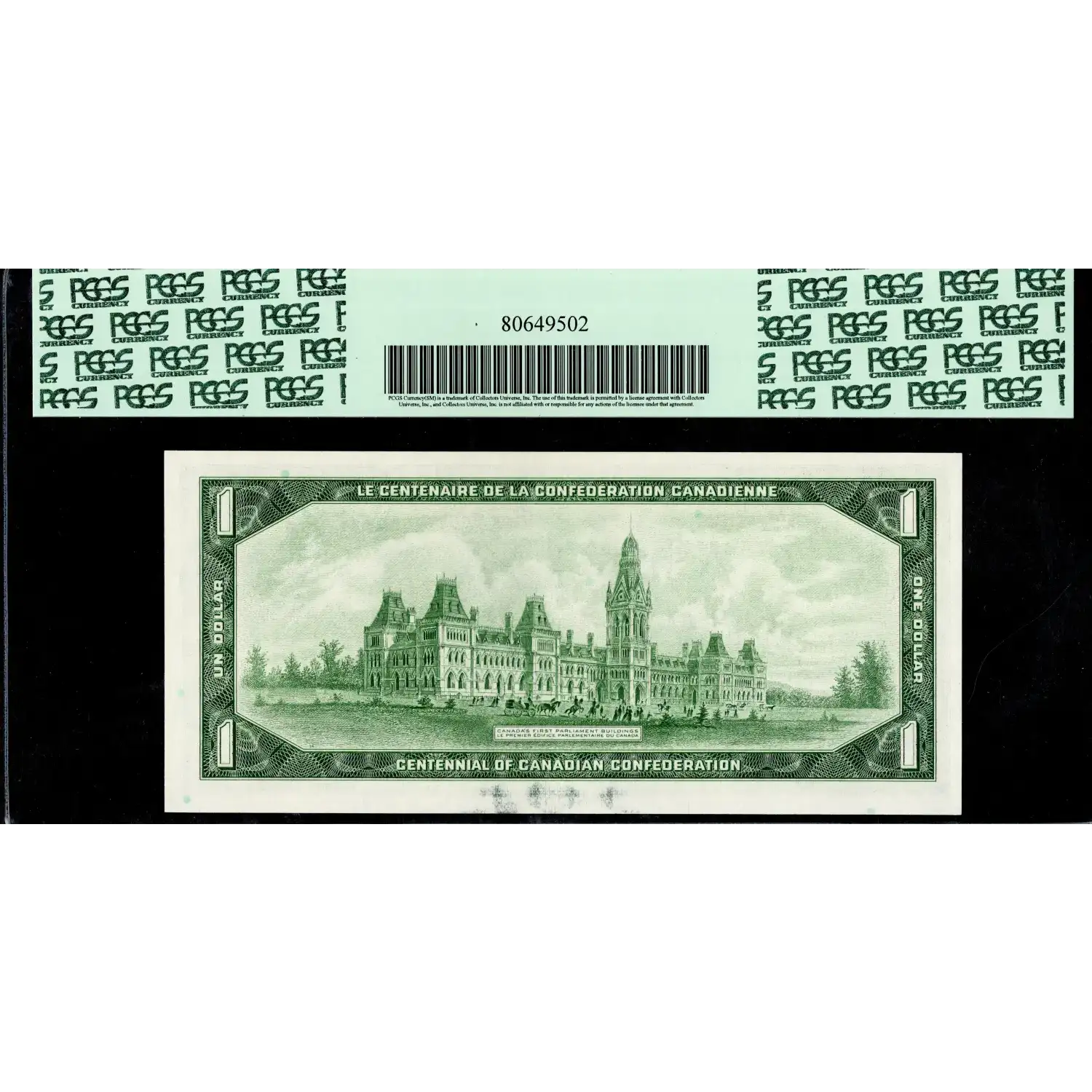 A beautiful high-grade example of the popular 1967 Canada $1 Centennial commemorative issue featuring the famous “Devil’s Face” design element subtly visible in the Queen’s hair. Printed to celebrate Canada’s 100th anniversary, this single-year type remains one of the most sought-after modern notes in the Canadian series.