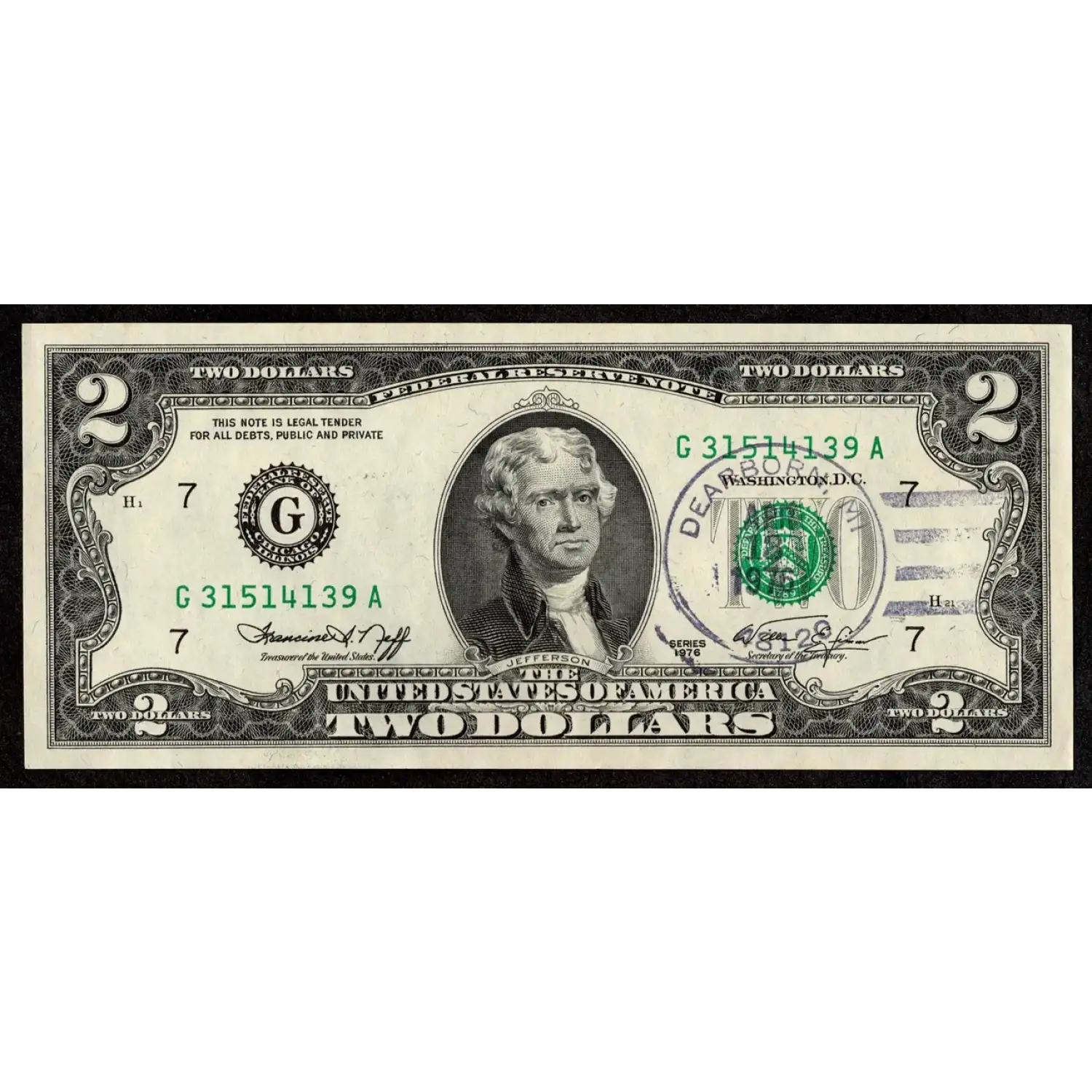 An exciting First Day Cancellation bicentennial deuce stamped on the first day of release, April 13, 1976 from a post office in Dearborn, MI (zip code: 48120.)