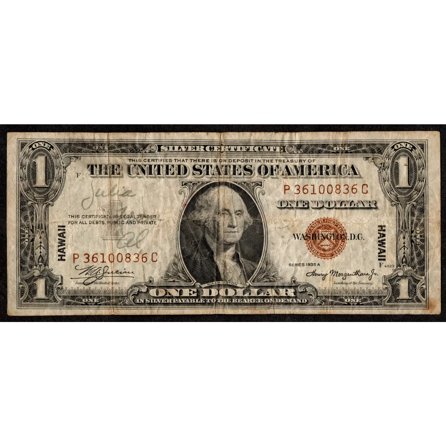 A historic piece of WWII currency, this $1 1935-A Hawaii note was issued after the attack on Pearl Harbor as part of a special emergency series. These notes feature brown seals and overprints, and were created so that—if the islands fell to enemy forces—the U.S. government could quickly declare them worthless to protect mainland currency reserves.