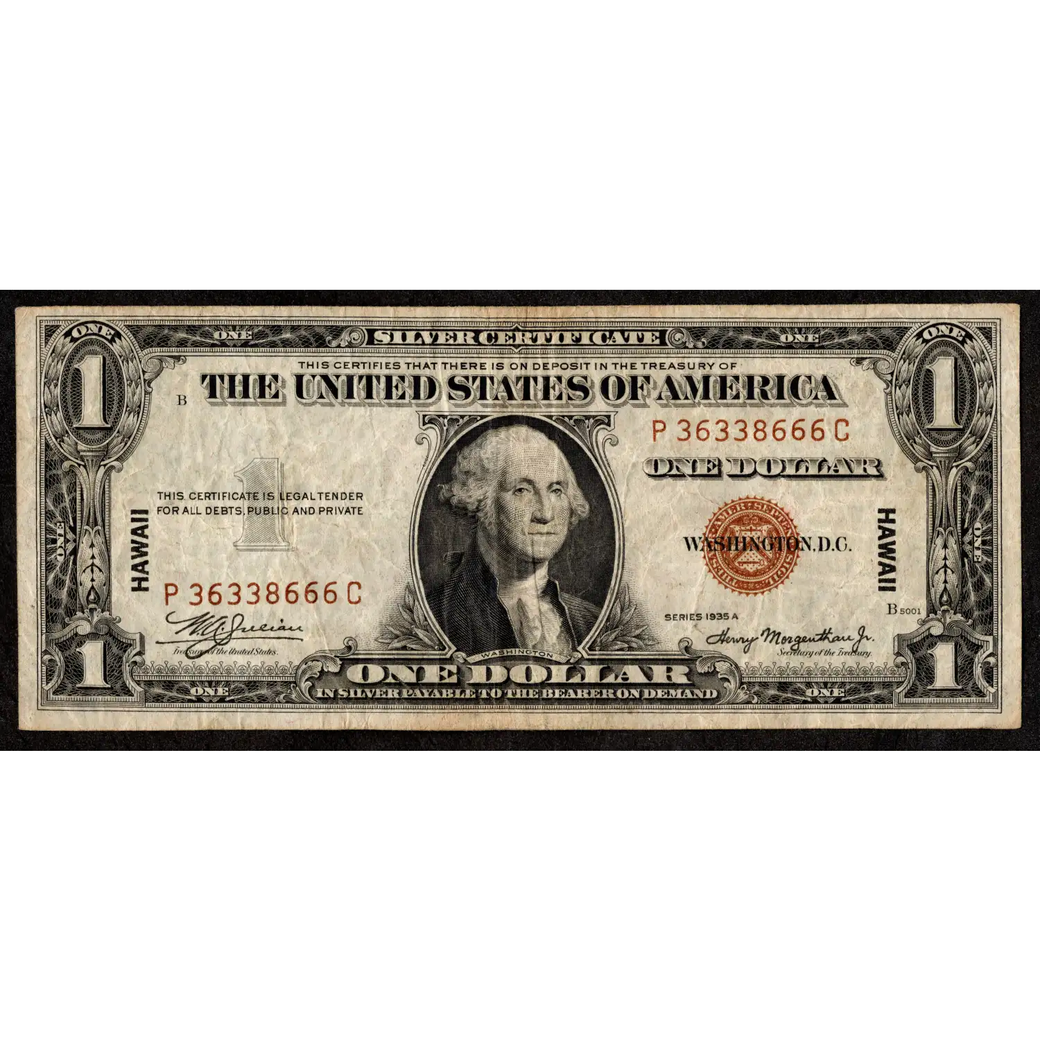 A historic piece of WWII currency, this $1 1935-A Hawaii note was issued after the attack on Pearl Harbor as part of a special emergency series. These notes feature brown seals and overprints, and were created so that—if the islands fell to enemy forces—the U.S. government could quickly declare them worthless to protect mainland currency reserves.