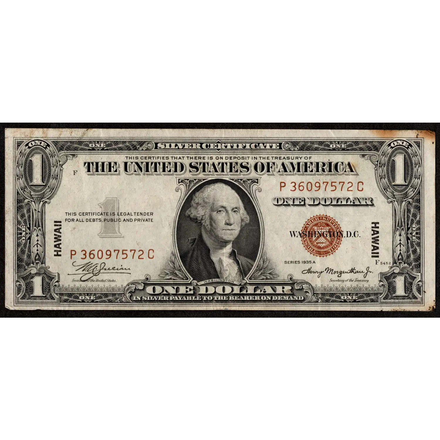 A historic piece of WWII currency, this $1 1935-A Hawaii note was issued after the attack on Pearl Harbor as part of a special emergency series. These notes feature brown seals and overprints, and were created so that—if the islands fell to enemy forces—the U.S. government could quickly declare them worthless to protect mainland currency reserves.
