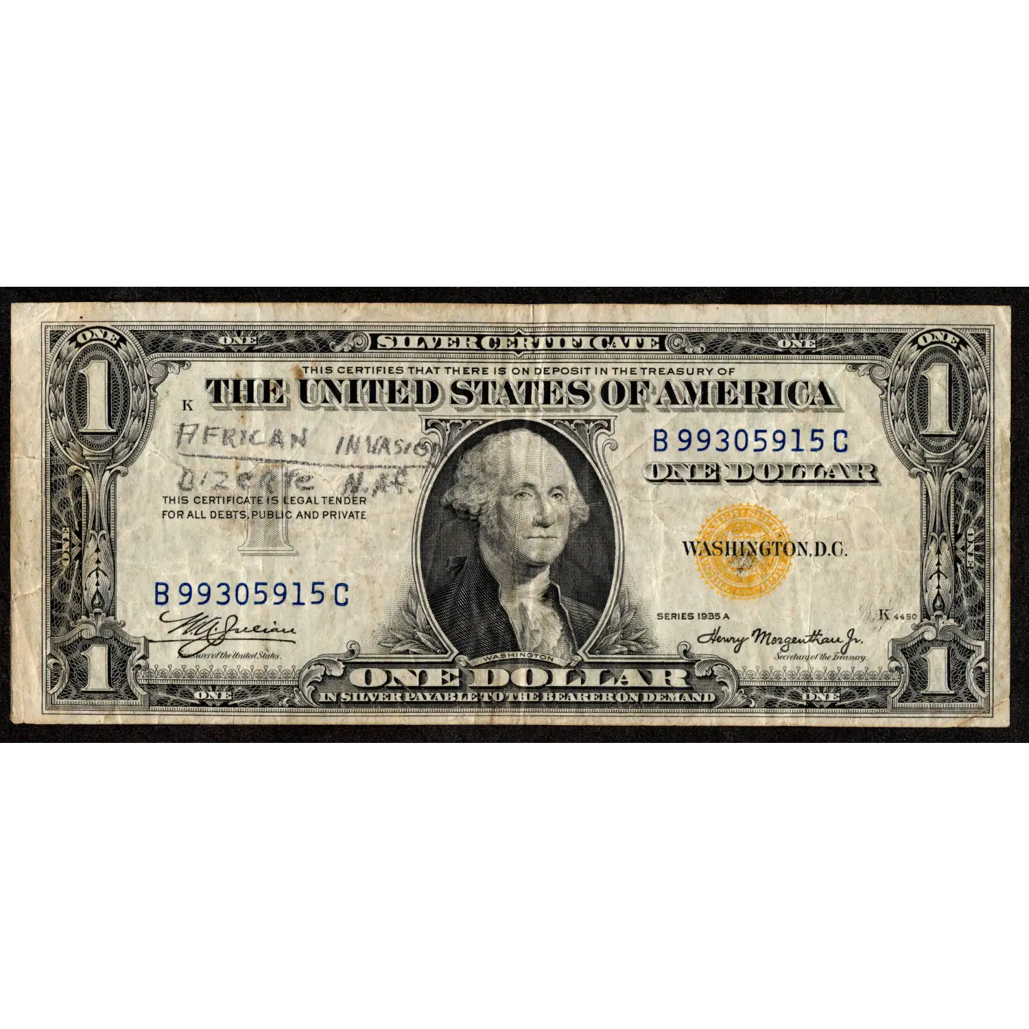 This $1 1935-A North Africa Silver Certificate is part of the special WWII Emergency Issue series printed for U.S. troops operating in the North African and Mediterranean theaters. These notes feature the distinctive yellow Treasury seal—a design chosen so that, if large quantities were captured by enemy forces, the U.S. government could easily identify and invalidate them without disrupting the national money supply.