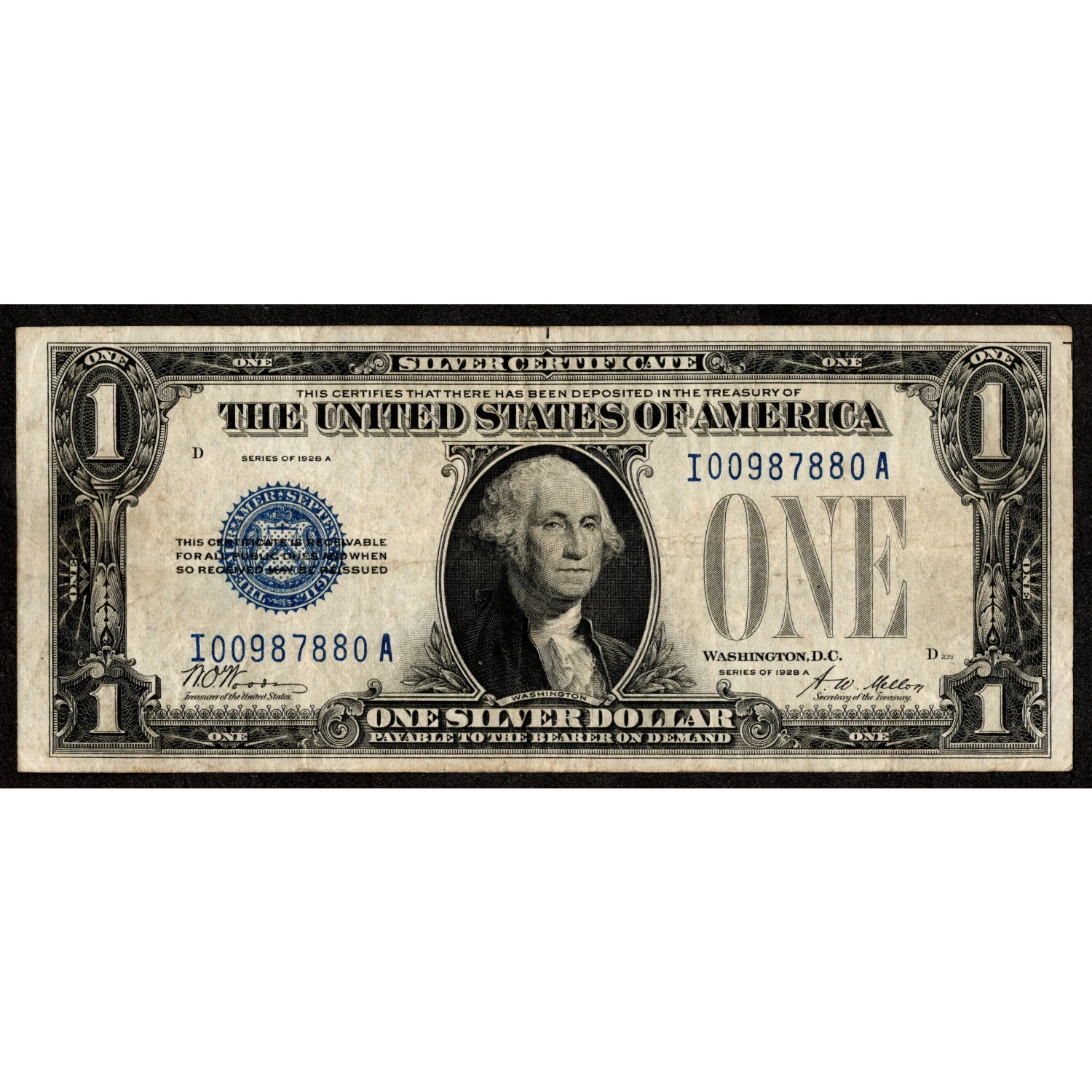 A classic early small-size type, this $1 1928-A Silver Certificate (Fr. 1601) comes from the beloved “Funny Back” series—so named for its ornate and highly decorative reverse design, unmistakably different from the modern $1 bill. Collectors prize these for their short production span, bold blue overprints, and foundational place in small-size history.