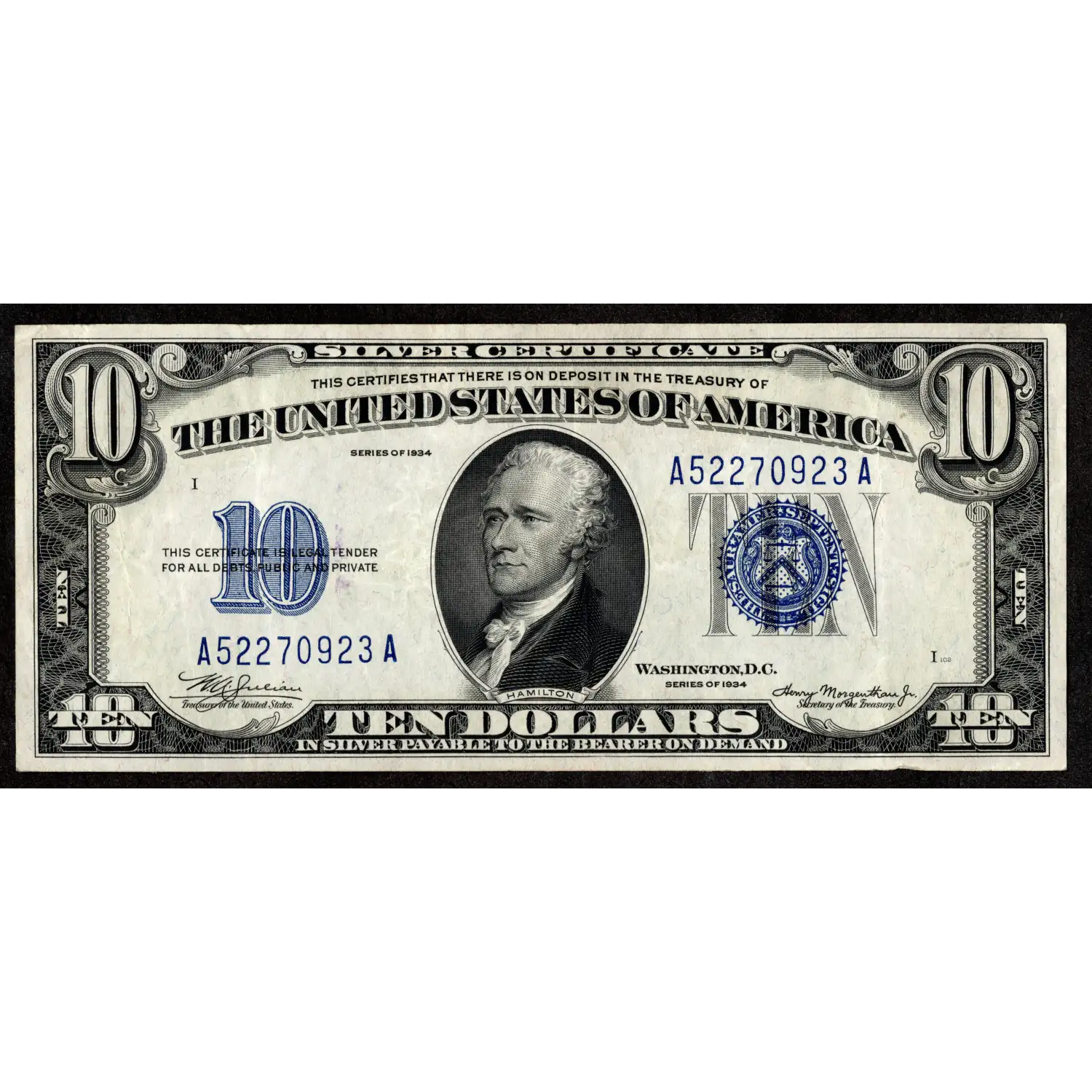 A foundational note for small-size collectors, this $10 1934 Silver Certificate (Fr. 1701) represents the first year the United States issued the $10 denomination in the modern small-size format. With its bold blue seal and classic early layout, it remains a must-have type note for any serious collection.