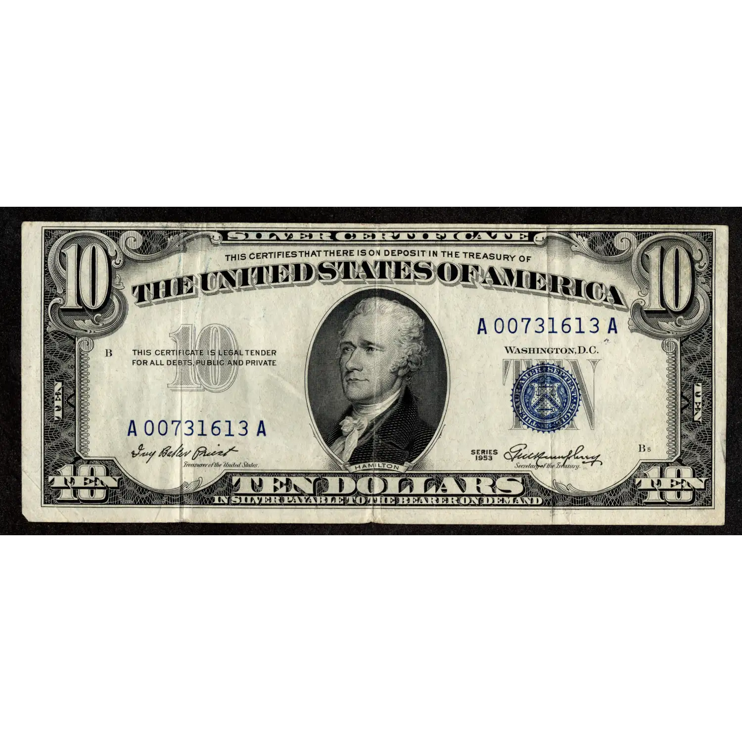 A classic and affordable Blue Seal $10 Silver Certificate, this 1953 Fr. 1706 is a staple for collectors assembling small-size type sets or Silver Certificate denomination runs. With its bold blue Treasury seal and traditional layout, it represents one of the final series of Silver Certificate production before the transition to modern Federal Reserve Notes.