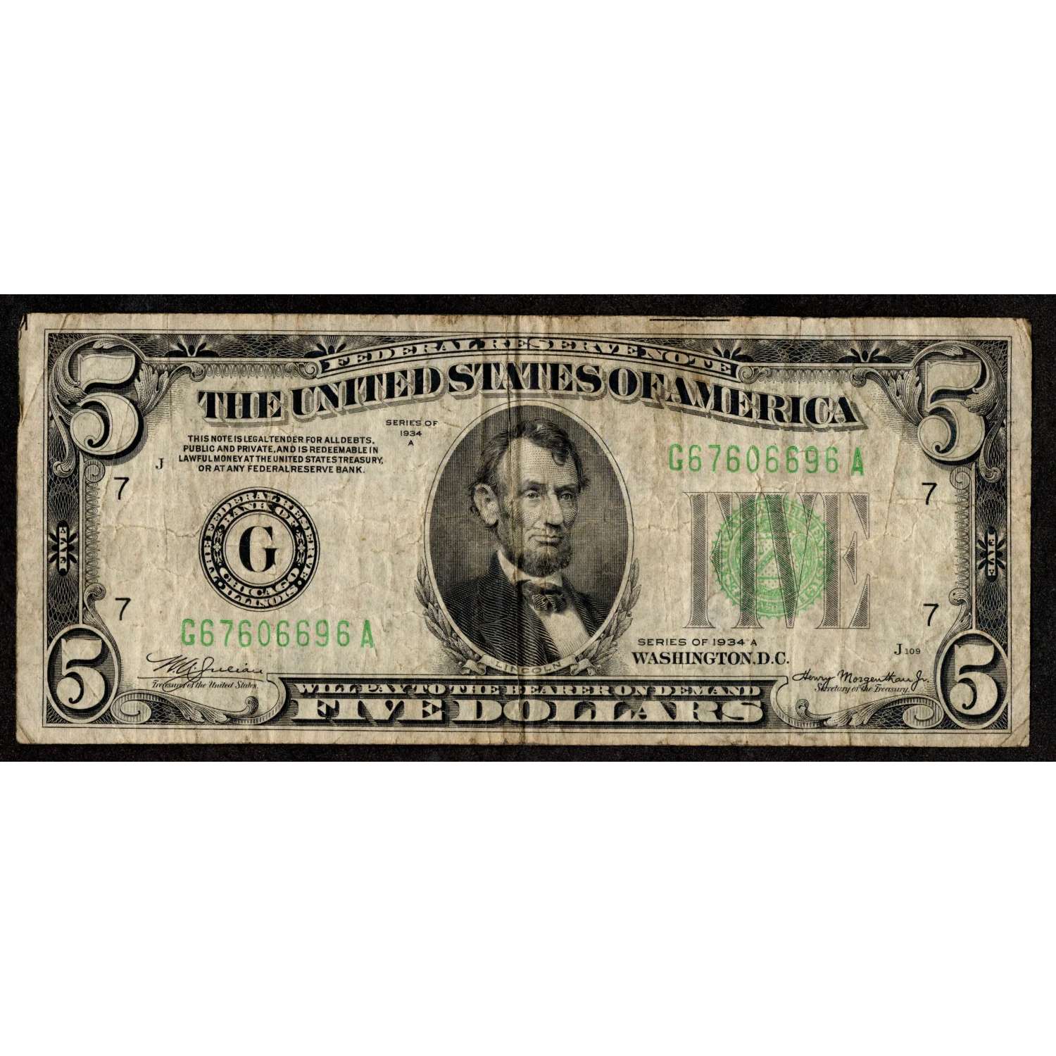 A classic 1934-A Chicago Federal Reserve Note, this piece features the iconic “Legal Tender for All Debts, Public and Private” clause—one of the defining legal statements on mid-20th-century U.S. currency. Issued during a time when Chicago was still buzzing with the aftershocks of its notorious Prohibition-era underworld, notes like this circulated through the same neighborhoods, storefronts, and backroom establishments tied to the city’s legendary gangster history.