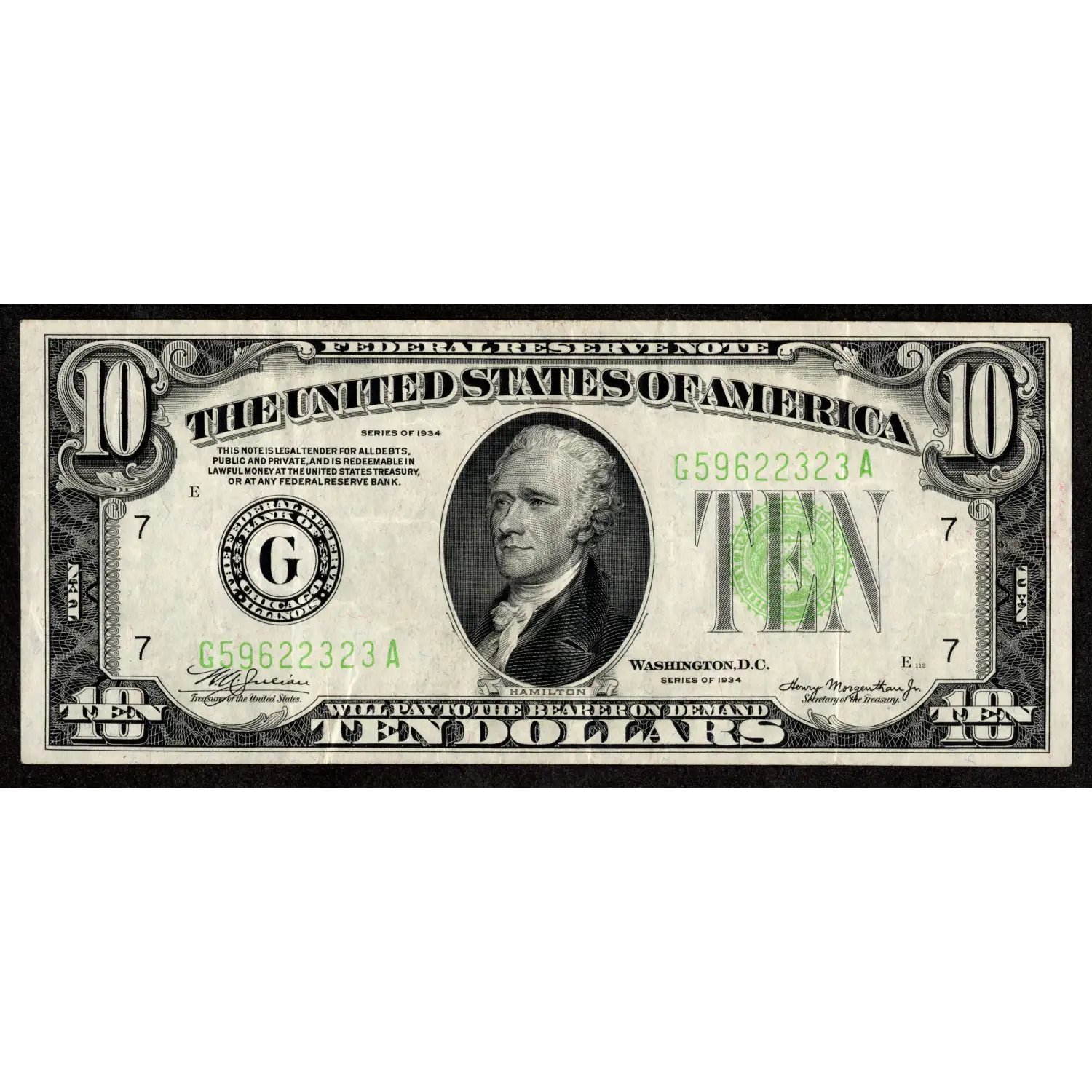 A gorgeous example of the 1934 Chicago $10 Federal Reserve Note, this Fr. 2004-G comes from the era forever linked to the city’s legendary underworld—where notes just like this circulated through bustling streets, smoky clubs, jazz halls, and the remnants of Chicago’s gangster-era economy.