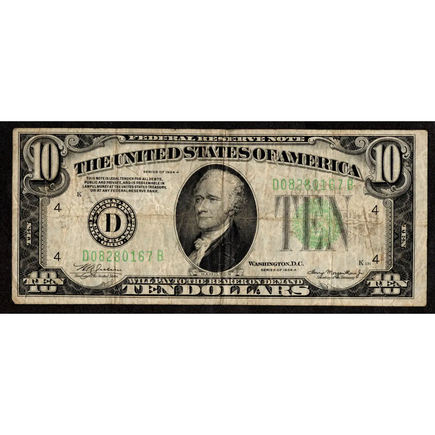 A strong and appealing example of the 1934-A $10 Federal Reserve Note from the Cleveland district, this Fr. 2006-D features the classic early-FRN layout along with the historic “Legal Tender for All Debts, Public and Private” clause prominently displayed—one of the defining features of mid-20th-century U.S. currency.