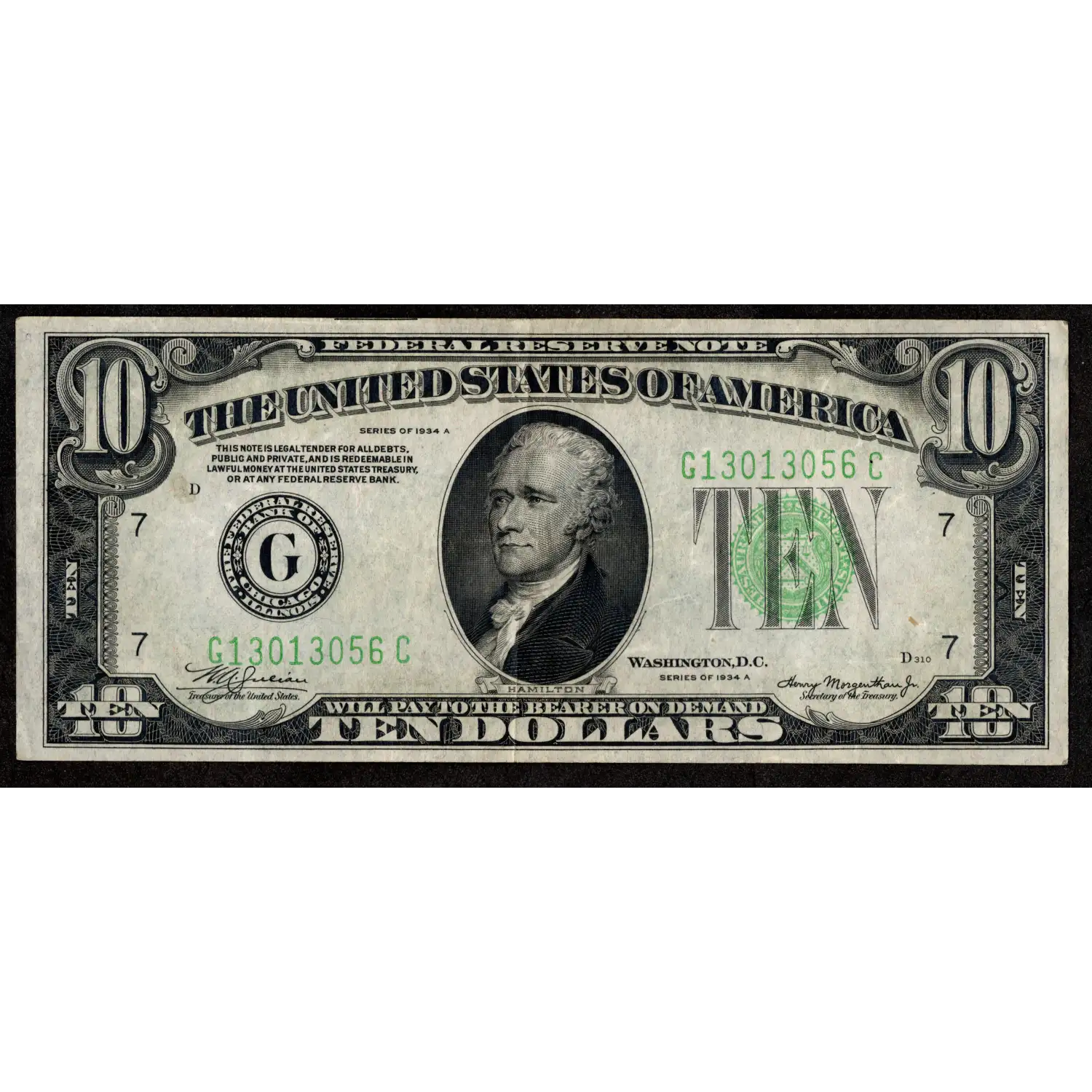 A strong and appealing example of the 1934-A $10 Federal Reserve Note from the Chicago district, this Fr. 2006-G features the classic early-FRN layout along with the historic “Legal Tender for All Debts, Public and Private” clause prominently displayed—one of the defining features of mid-20th-century U.S. currency.