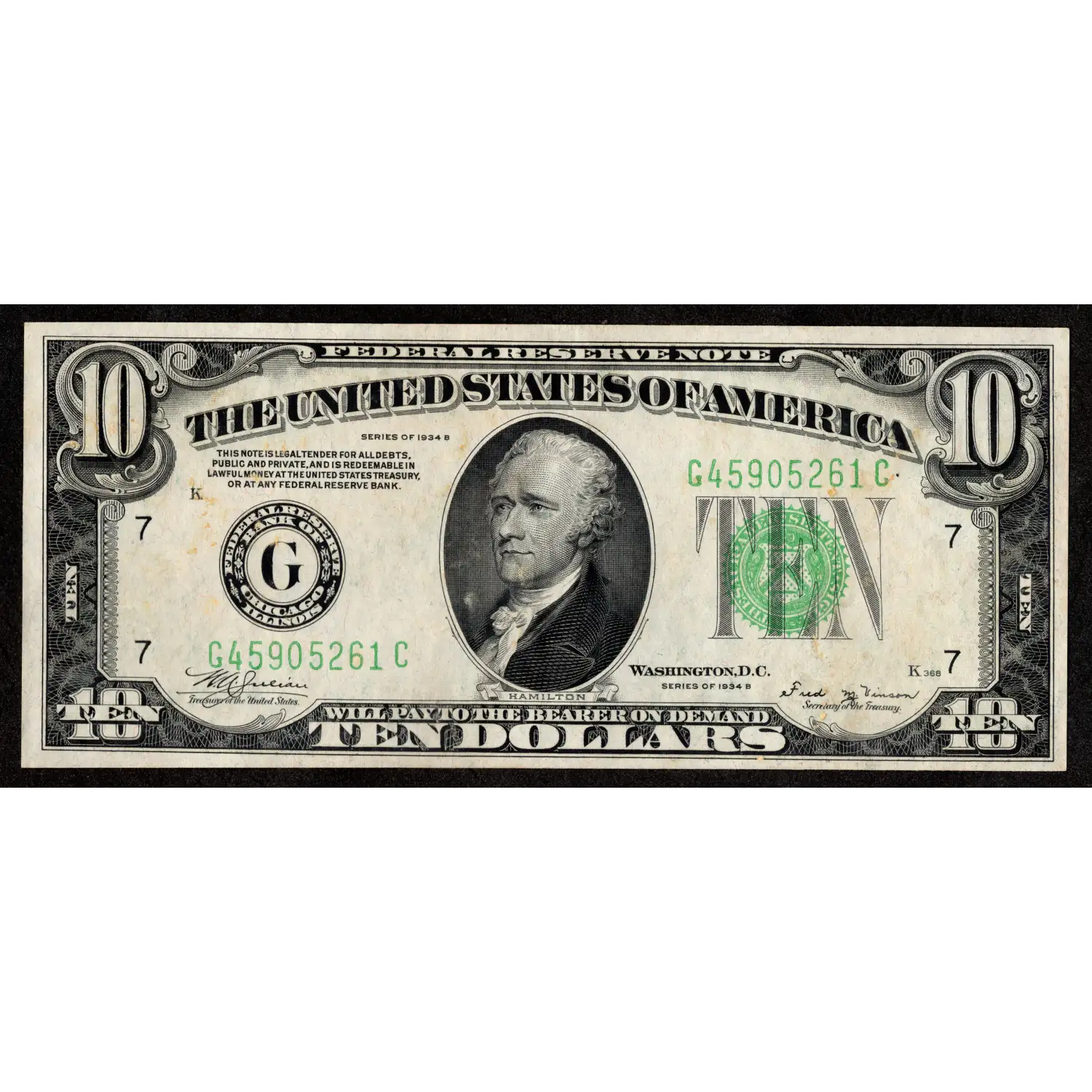 A sharp and attractive 1934-B Chicago $10 Federal Reserve Note, this Fr. 2007-G features the classic green seal, bold district markings, and the historic “Legal Tender for All Debts, Public and Private” clause that defines early small-size Federal Reserve Notes.