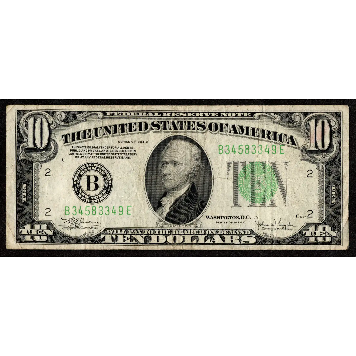 A solid and affordable example of an early small-size $10 Federal Reserve Note, this 1934-C New York issue (Fr. 2008-B) features the classic green seal and the historic “Legal Tender for All Debts, Public and Private” clause that defines mid-century U.S. currency. These early 1934-series tens have strong collector appeal, especially from major financial districts like New York.