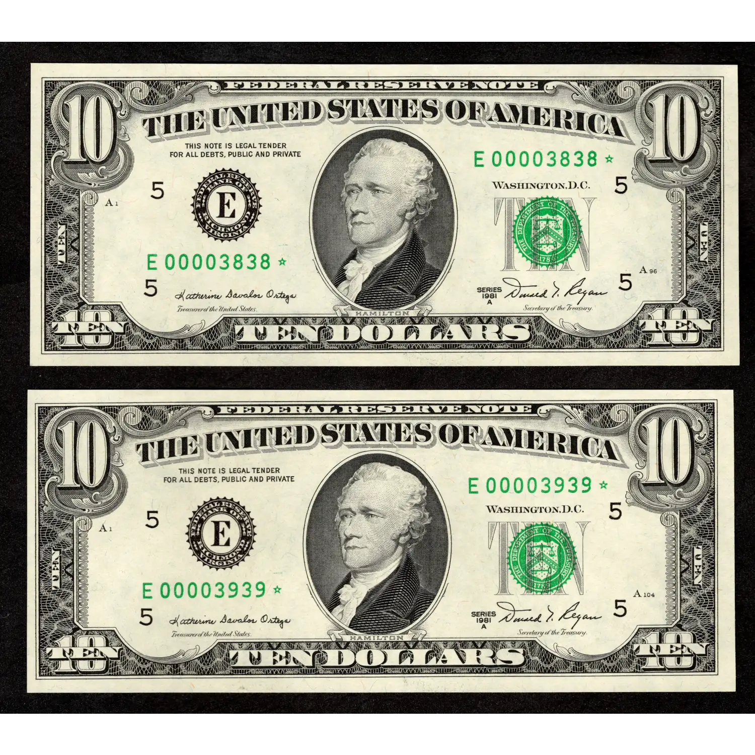 A striking pair of four-digit star fancy numbers, this duo of $10 1981-A Federal Reserve Notes features mini-repeater structures with strong visual rhythm. Both notes are Choice Crisp Uncirculated, offering bright paper, sharp corners, and full originality.
