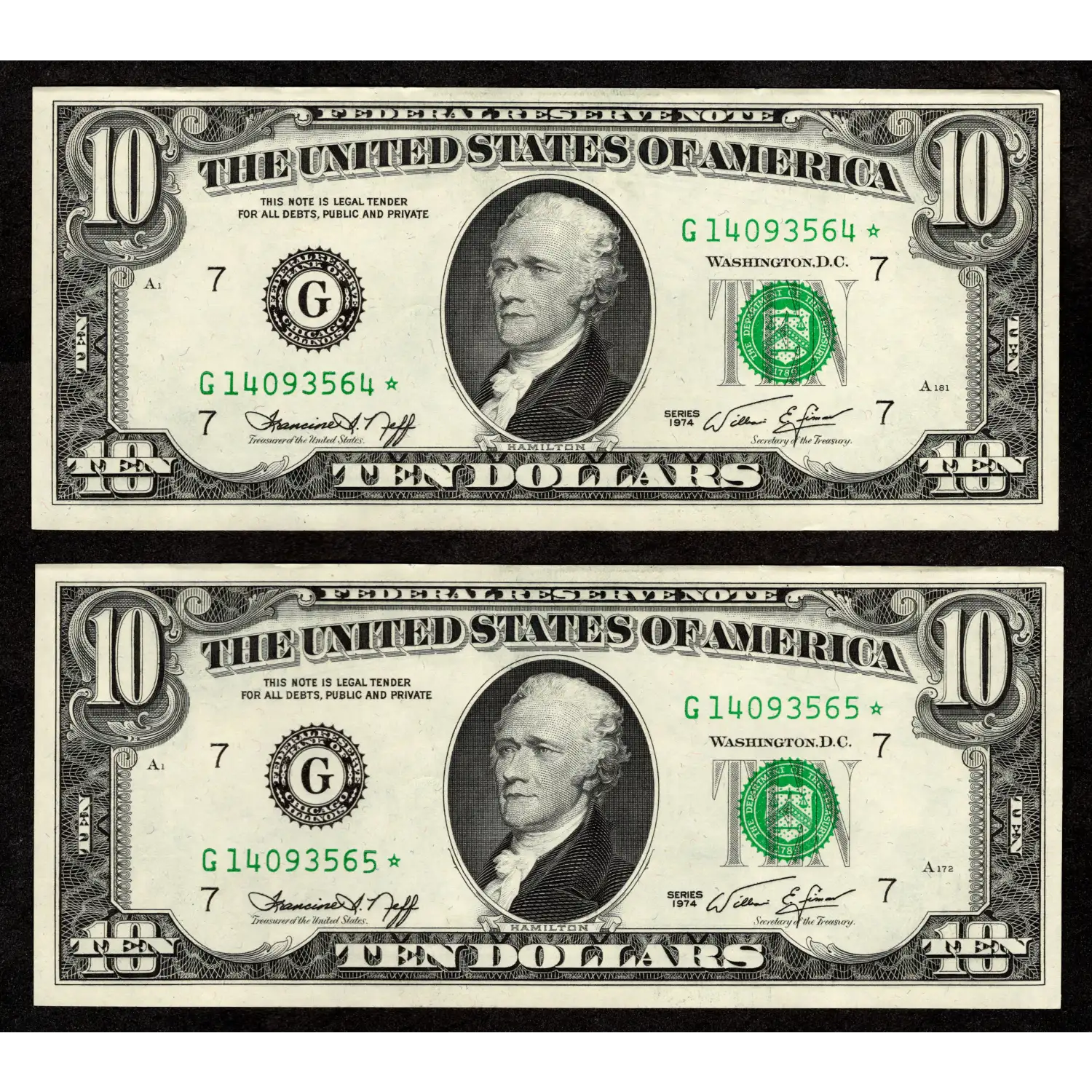 CONSECUTIVE PAIR — $10 1974 Federal Reserve Notes