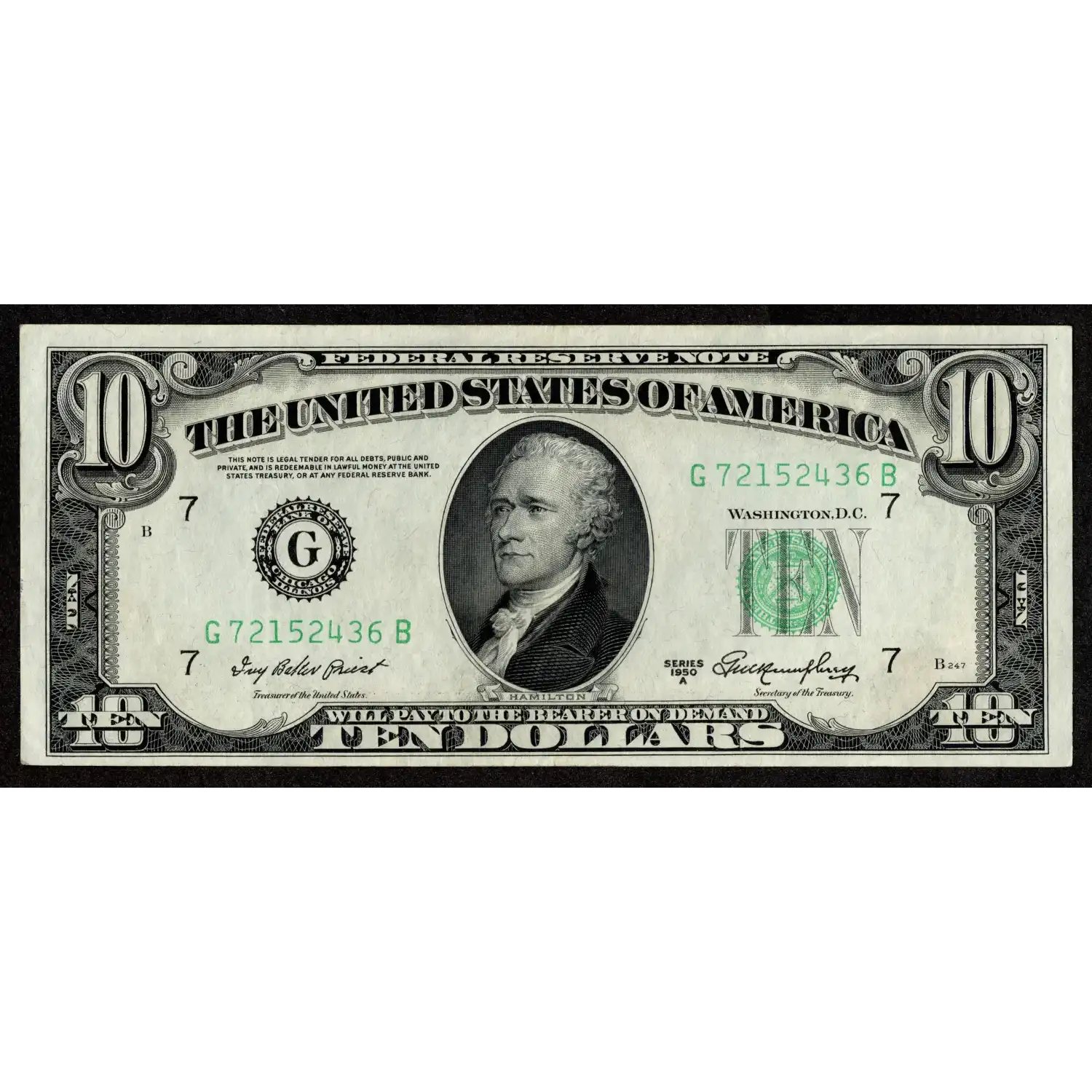 A crisp, high-grade example of the classic 1950-A Chicago $10 Federal Reserve Note, this Fr. 2011-G features the traditional small-head Hamilton portrait and the beloved old-design layout used for mid-century tens prior to the modern redesigns. Bold green seal, strong district markings, and timeless styling make this note an ideal type piece.