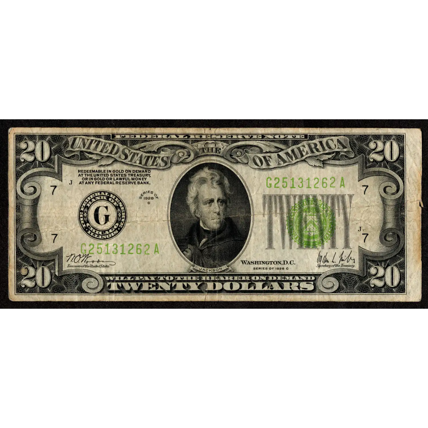 A classic early small-size Federal Reserve Note, this $20 1928-C Chicago issue (Fr. 2053-G) features the desirable Light Green Seal (LGS)—a bright, earlier shade used before the transition to darker green inks. These early-color varieties are sought after for their striking appearance and limited production.