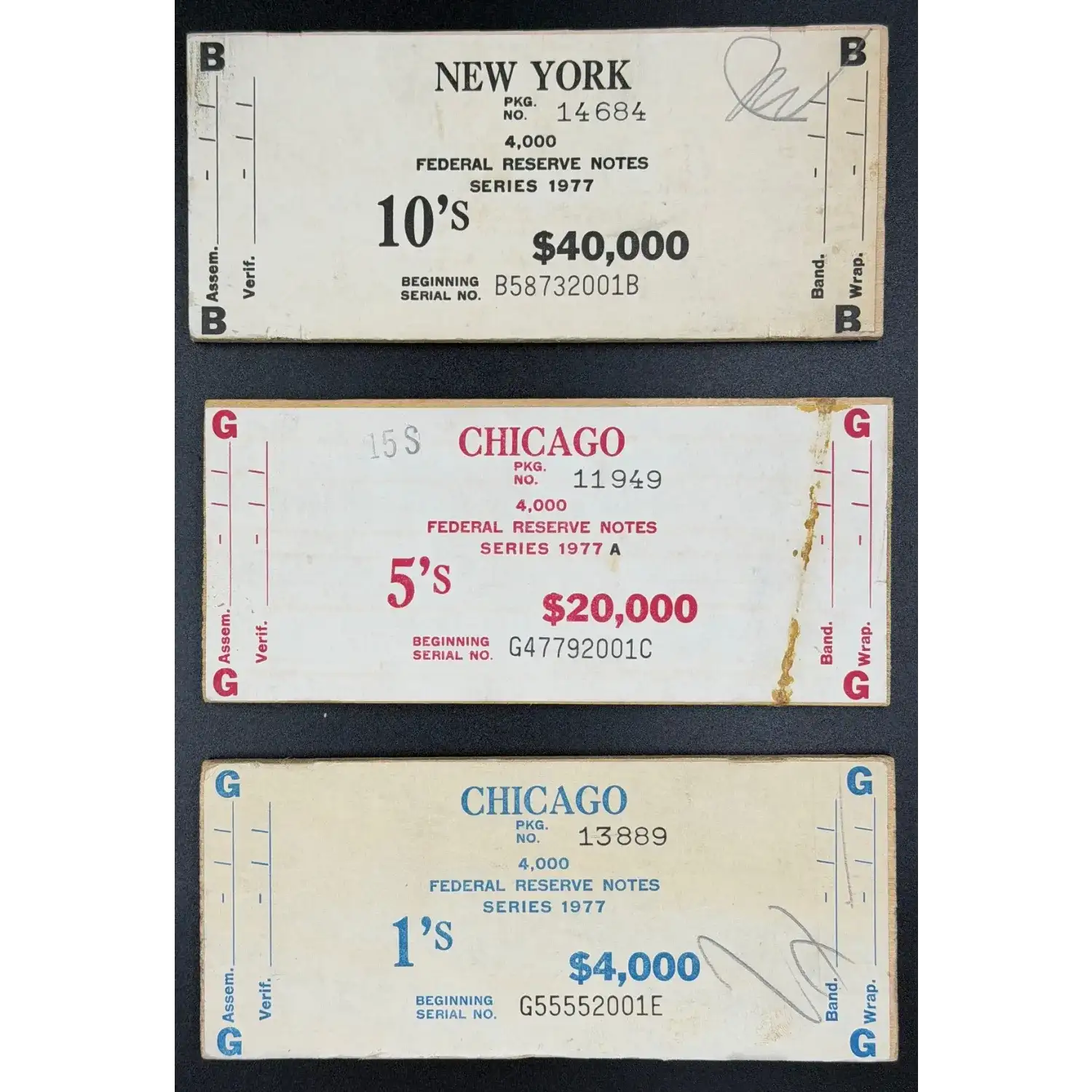 An excitng set of three original Bureau of Engraving and Printing wooden brick labels from the Series 1977 Federal Reserve Notes. These labels were used by the BEP as part of the original packaging process, mounted on wood to protect and identify full bricks of 4,000 notes during handling and distribution.