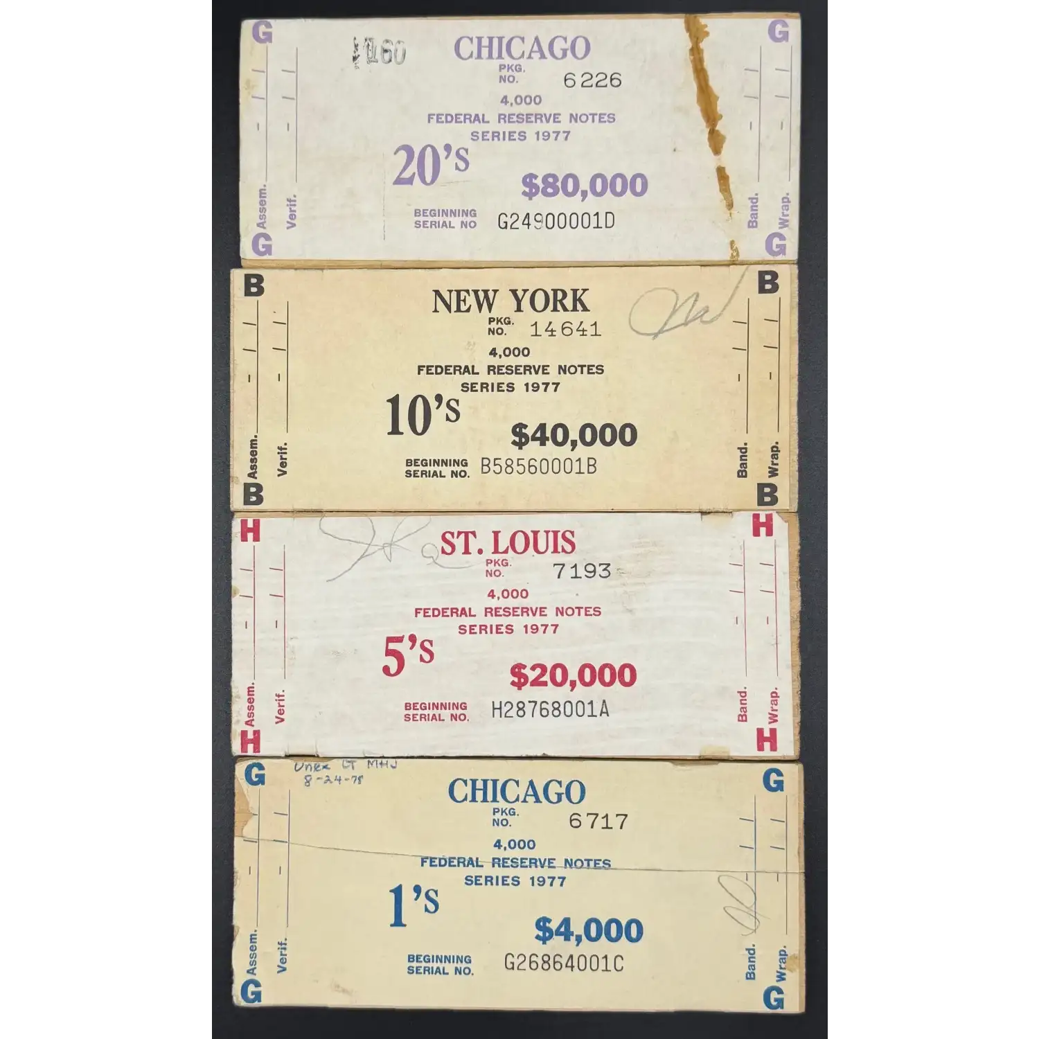 This matched group spans four different denominations, four different colors, and three different Federal Reserve districts, creating a visually striking and highly educational set that perfectly illustrates BEP brick distribution practices.