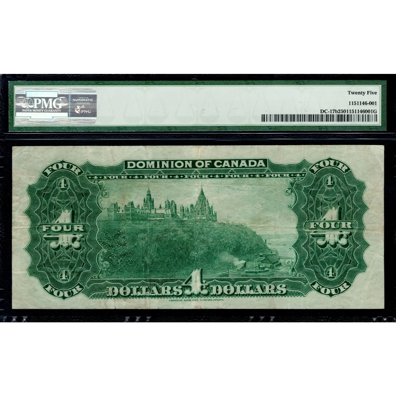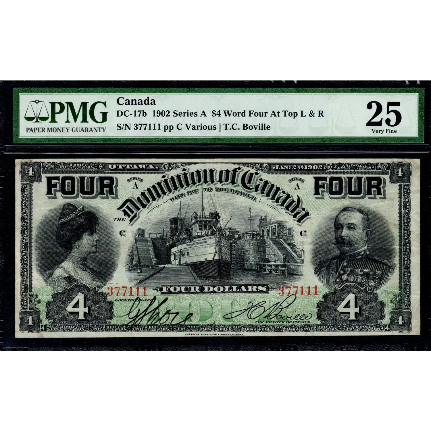 A visually appealing issue printed by The American Bank Note Company, featuring portraits of the Countess and Earl of Minto with "FOUR" in the upper left and right. This was the last of the $4 denominations printed, and was only in issue for a short period, from June to September of 1911 to alleviate a shortage of paper money. When the shortage abated, production of these notes ceased and they were withdrawn from circulation by the Department of Finance in the beginning of following year -- making it easily the scarcest of the three Charlton numbers for this denomination. We're beyond thrilled to have such an exciting example of a scarce note preserved with eight exceptional margins, bold inks, incredible eye-appeal, and an even better story for this odd denomination Canadian trophy.